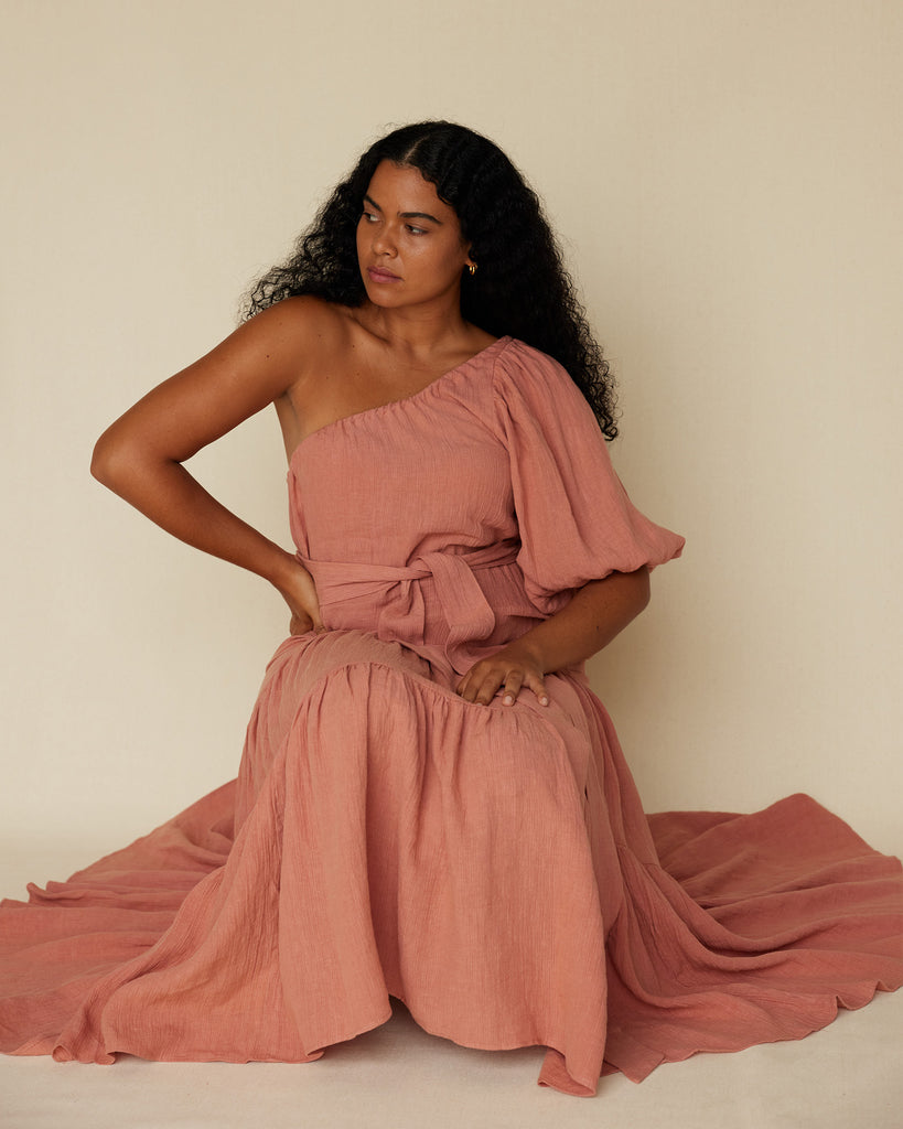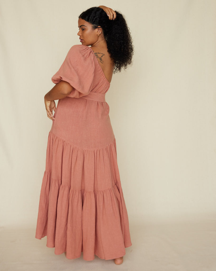 Forever wishing for an eternal summer with the Saloma Linen One Shoulder Dress. Cut from a quality 100% linen fabrication, this beautiful dress delivers all expectations. Defined by its one shoulder, it features a blouson sleeve outlined by a single ruffle, a removable self-covered belt to enhance the waist and a tiered skirt that falls into an a-line cut for easy movement. Perfect for day or night.