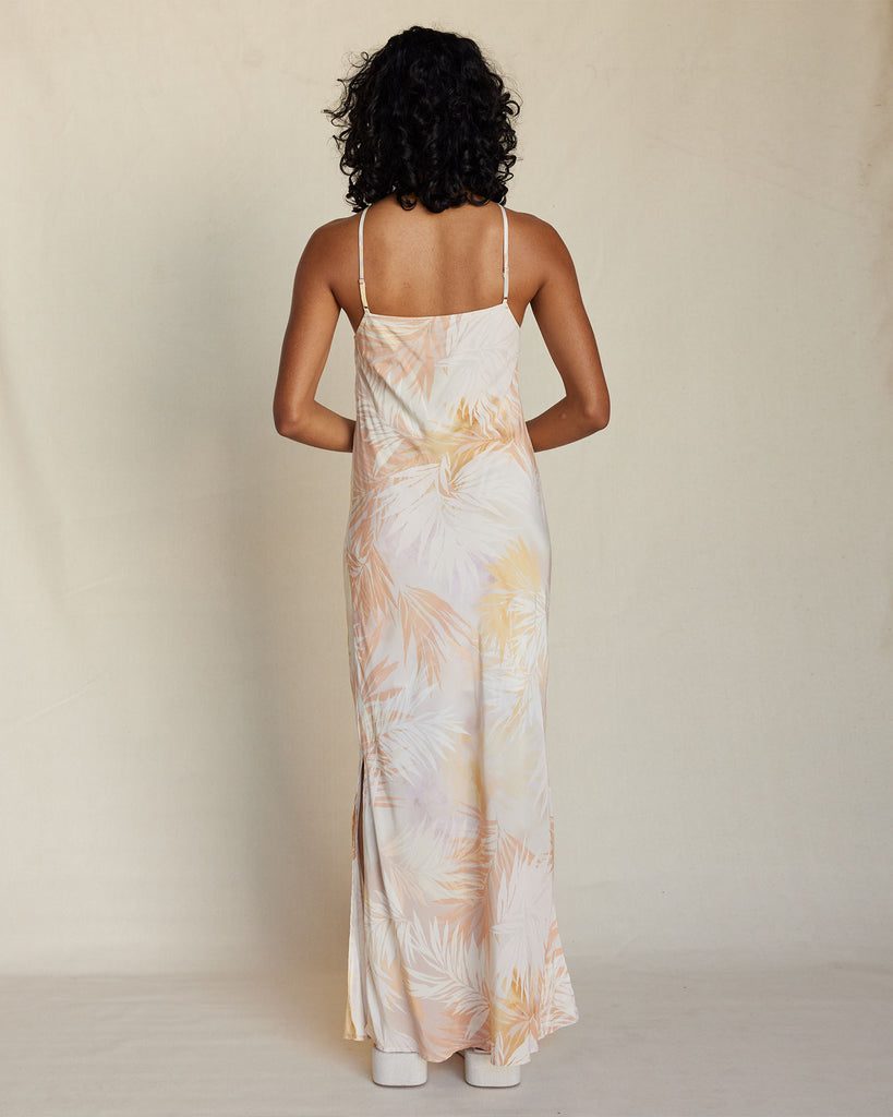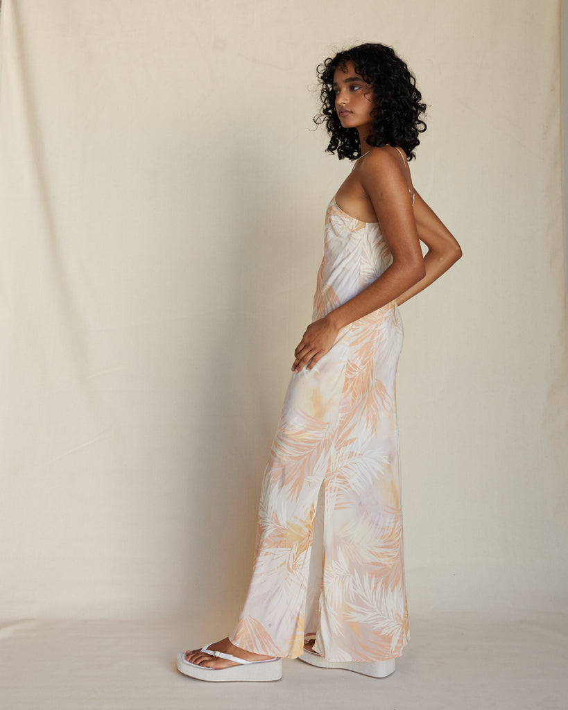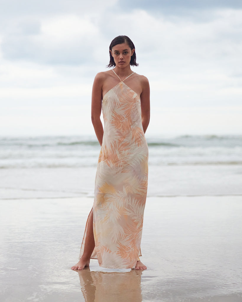 Softly decorated with our exclusive blush palm print, the Yasmine Printed Halter Maxi dress features an x-shape halter neck with delicate spaghetti straps, side slits, invisible zip fastening and lining to the knee. A silky viscose fabrication allows for a flowy, body-skimming fit designed to stun at your next wedding or party.