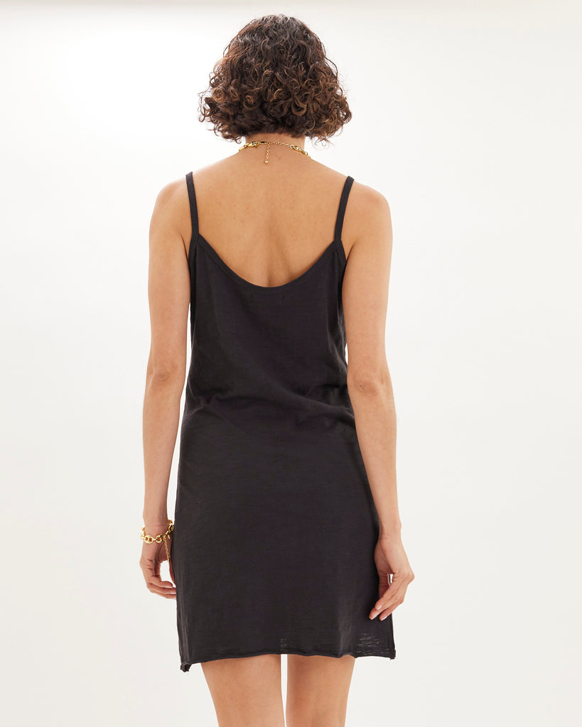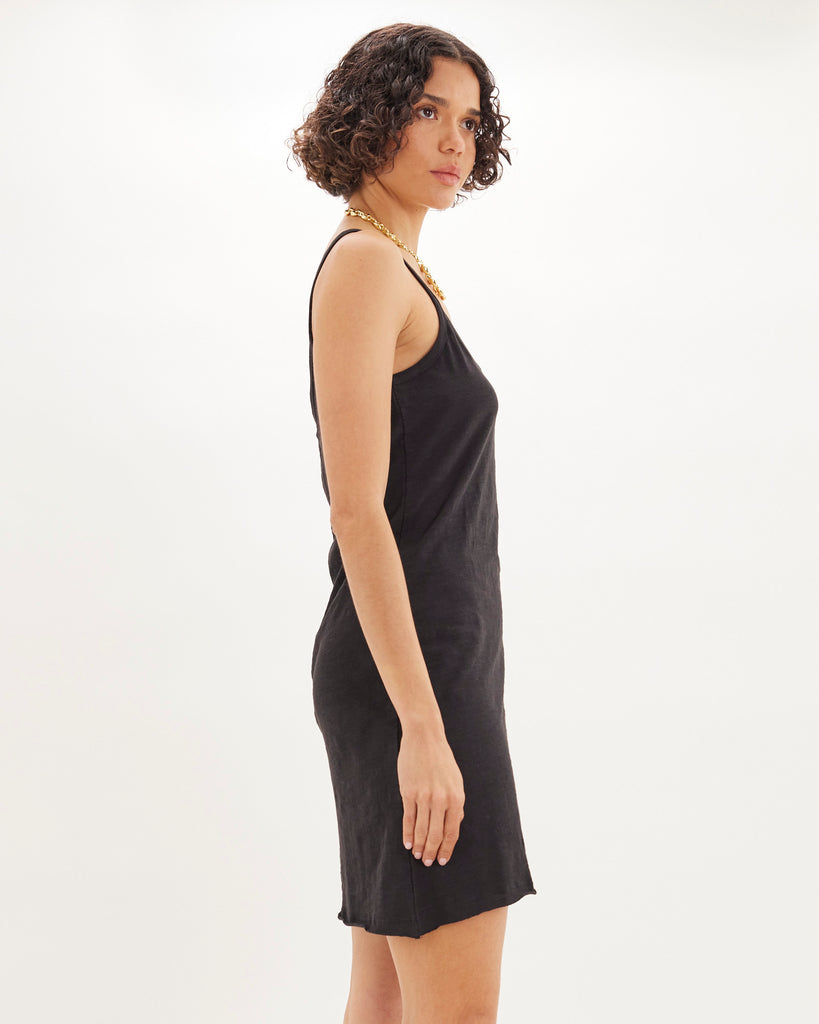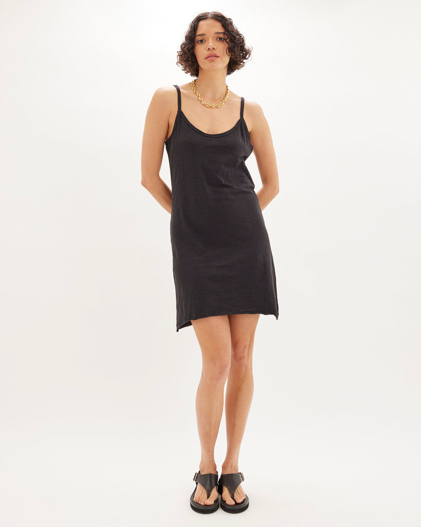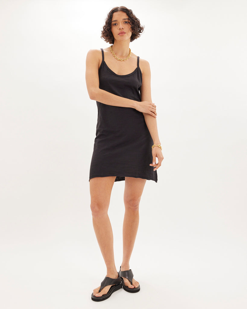 The Collins Tank Dress is crafted from 100% cotton with a lightweight, breathable hand feel. Designed with a relaxed fit, it features thin straps, a scoop neckline and a straight silhouette that skims the body with ease. A casual staple that can be worn alone or layered, it’s finished with a softly curved hem for subtle movement.