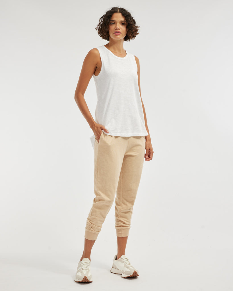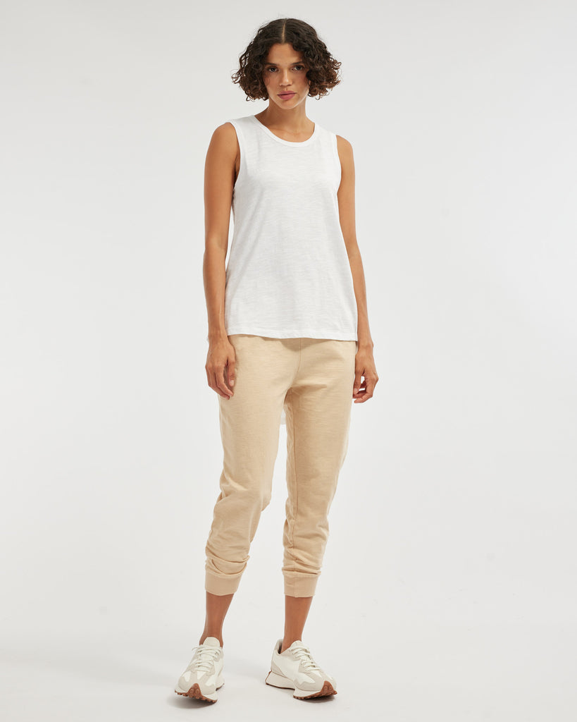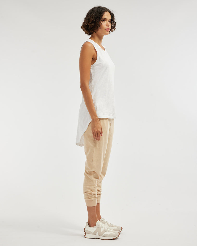 The Claudia Longline Tank features a crew neckline, regular bind finishes and a scoop hemline at back. Perfect for those who prefer a relaxed look with added coverage. Cut in our signature 100% organic cotton slub.
