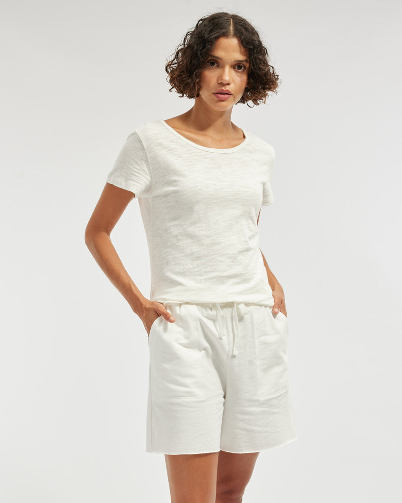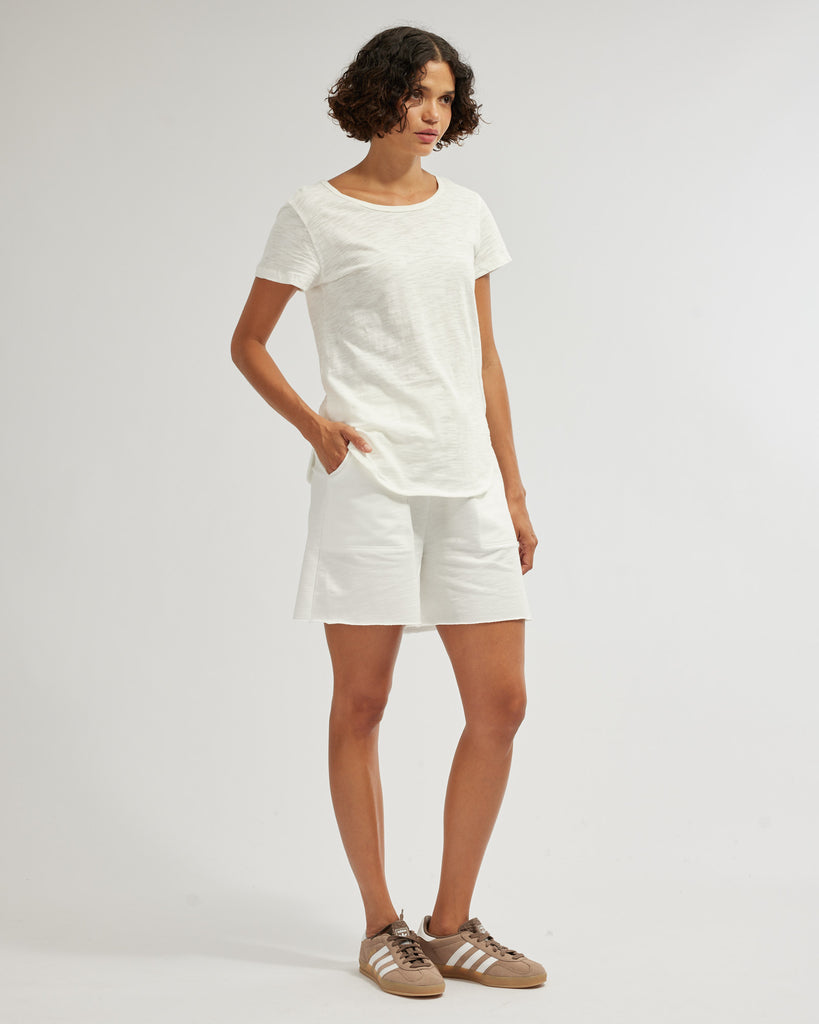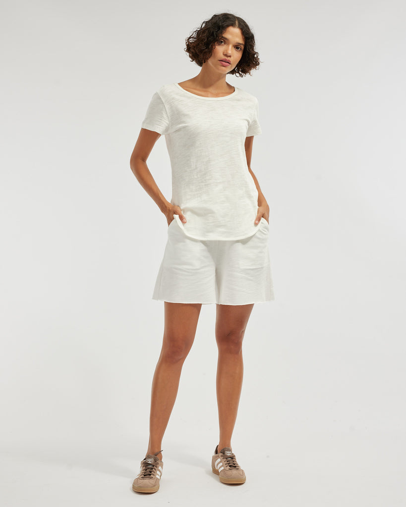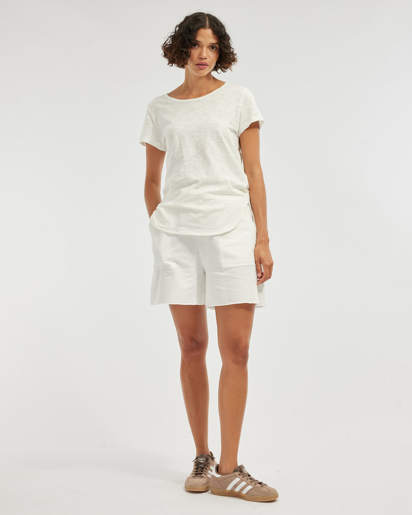 The Fallon Rounded Hem Tee is a casual wardrobe staple cut from soft slub cotton. It features a wide rounded neckline, short sleeves, and a relaxed fit. The curved, rounded hemline offers a flattering shape for everyday wear.