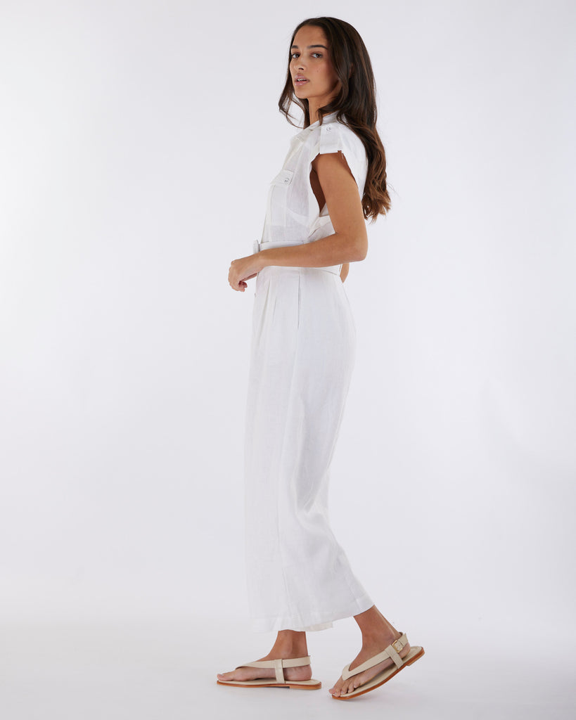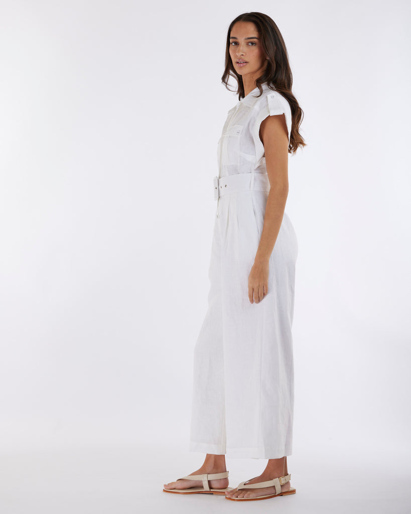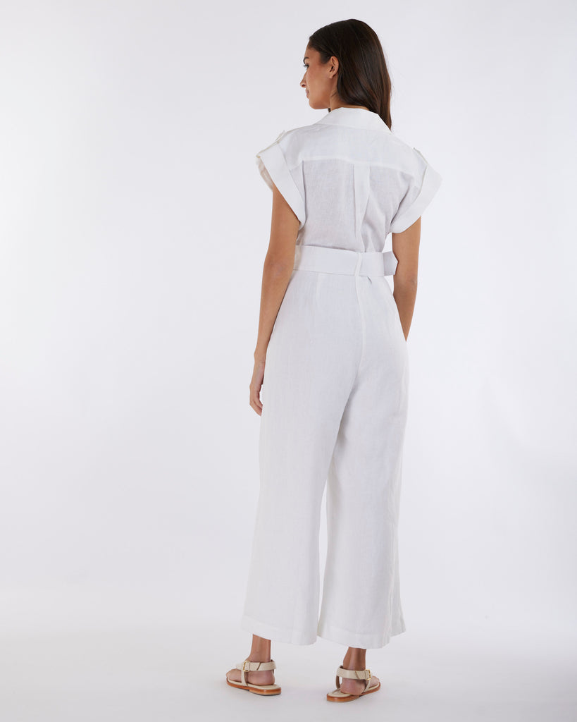 Designed for everyday ease, the Esra Linen Utility Jumpsuit sees you ready in minutes. Crafted in a travel-friendly linen blend, this lightweight jumpsuit is a weekender favourite that’s ready for a boots-on adventure and yet feels equally appropriate for a Sunday brunch. It’s detailed with a classic collar, side pockets, slant sleeves, buttoned front, and breast pockets. A high-waisted cut lengthens the silhouette and the waist is accentuated with a self-covered belt.