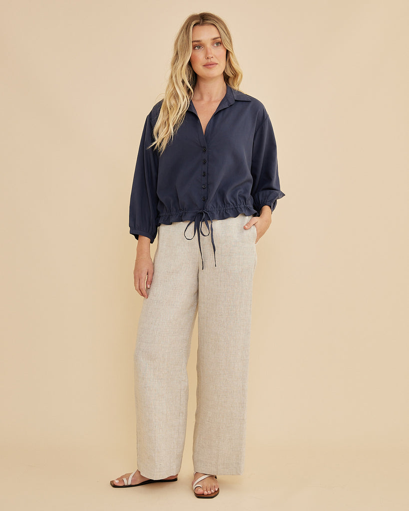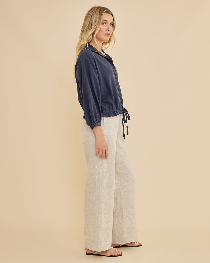 Introducing the Kate Long Sleeve Top – a refined piece that blends classic design with modern accents. Its cropped silhouette and adjustable drawstring hem add a touch of contemporary styling, while the collared neckline and long sleeves ensure a polished finish. Ideal for pairing with high-waisted separates for a balanced look.