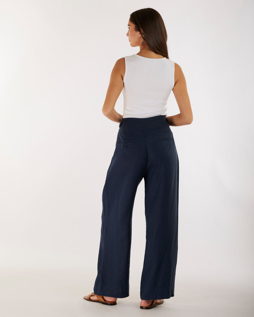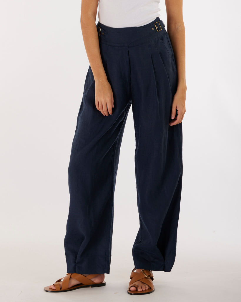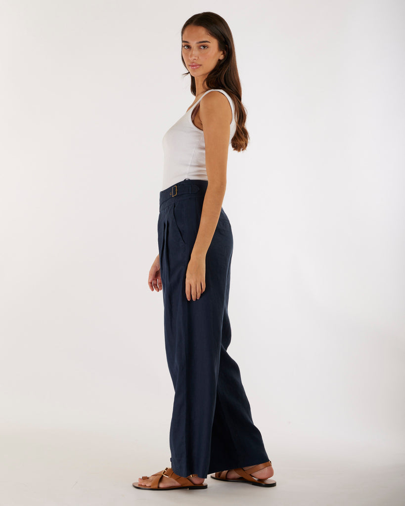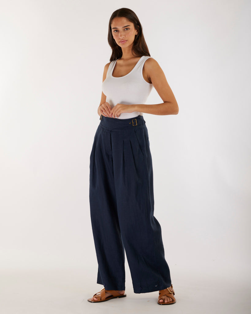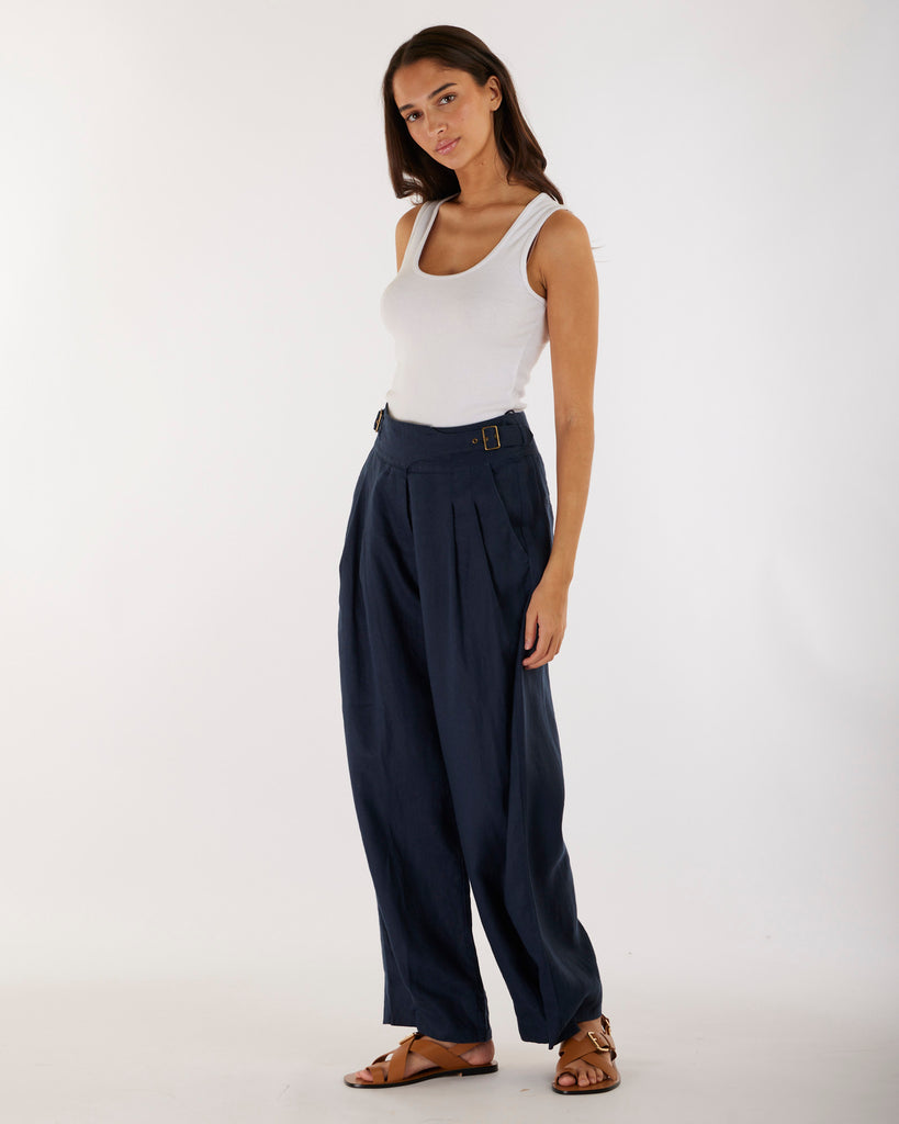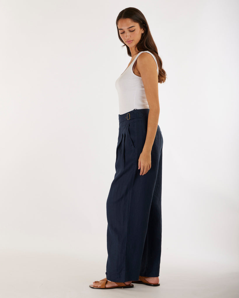 Destined to be your next forever linen pants, the Eugene Linen Pants features a naval gurkha buckled waistband, fully adjustable for a high or mid-waisted fit, dual side pockets and neat pleating for both a tailored and clasically sophisticated look.