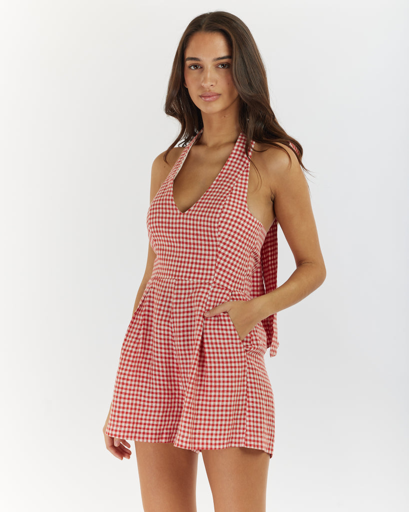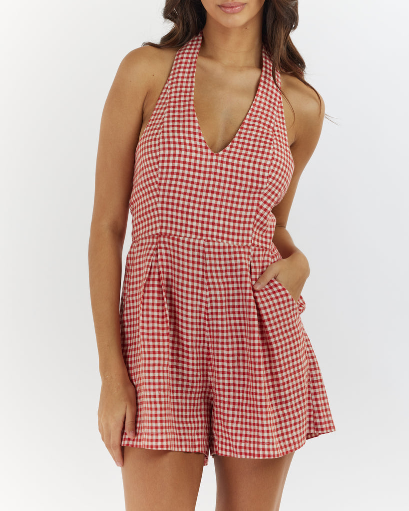 Inspired by 60's French Riviera styling, the Adele Gingham Halter Playsuit is a summer essential. Featuring exaggerated ties to create an oversized bow, dual side pockets and pure linen fabrication, it's a contemporary classic perfect for your next nautical adventure.