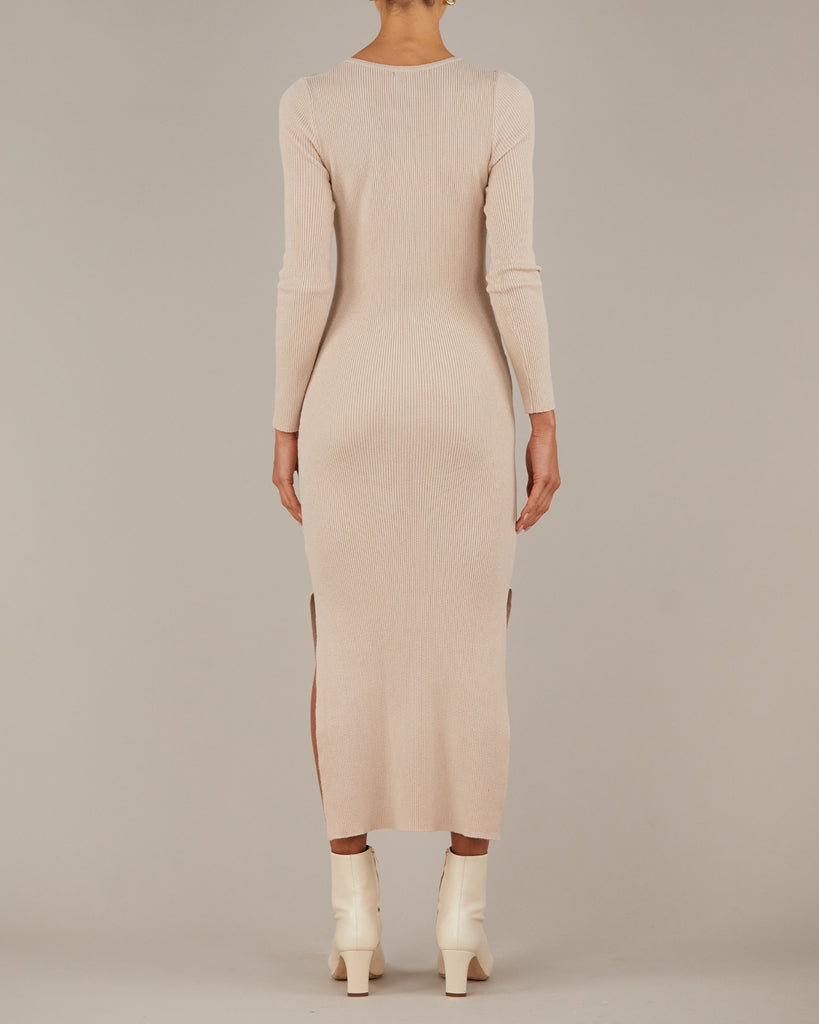 Elevate your wardrobe staples this season with the Afina Knit Dress. This midi-length knit dress is crafted from a viscose nylon blend for a soft and warm handle and features a classic crew neckline, full length sleeves, ribbed finishing, a fitted silhouette and dual side splits at the hem. Style yours with mules for an elegant and timeless look.