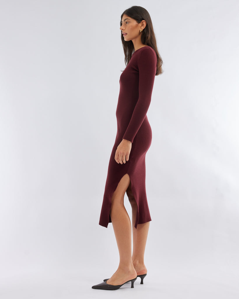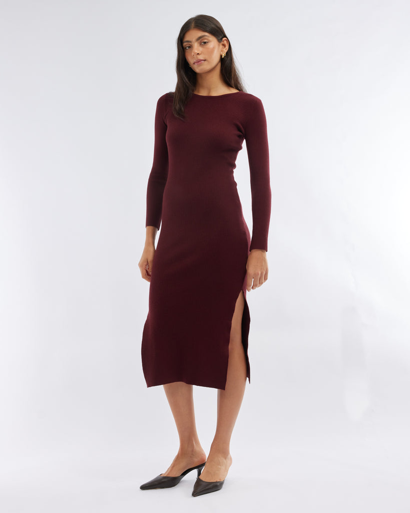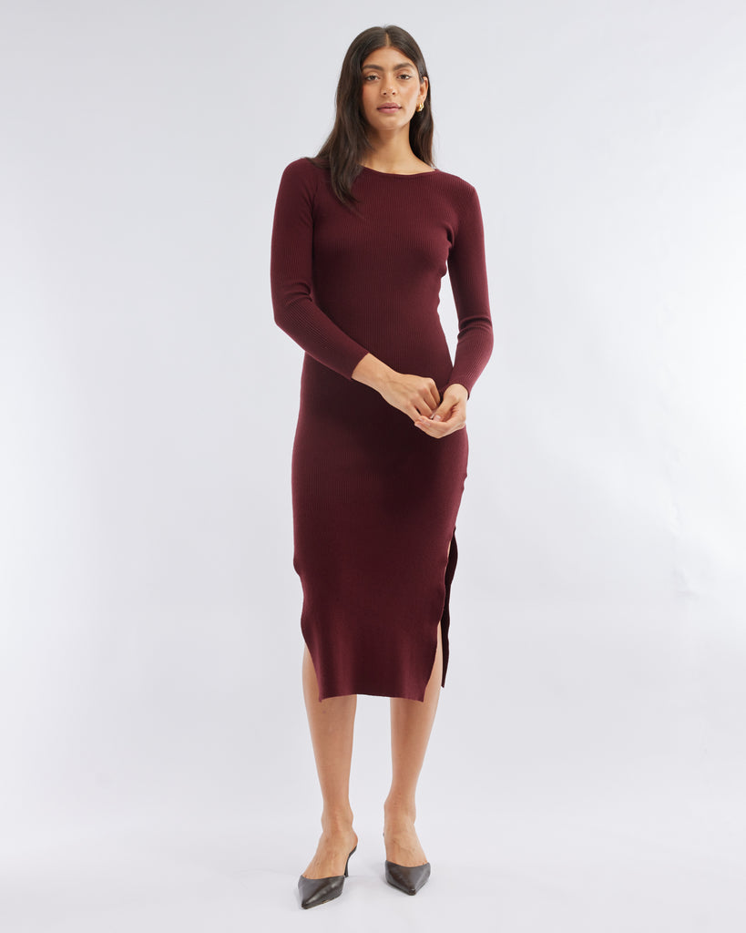 Elevate your wardrobe staples this season with the Afina Knit Dress. This midi-length knit dress is crafted from a modal nylon blend for a soft and warm handle and features a classic crew neckline, full length sleeves, ribbed finishing, a fitted silhouette and dual side splits at the hem. Style yours with mules for an elegant and timeless look.