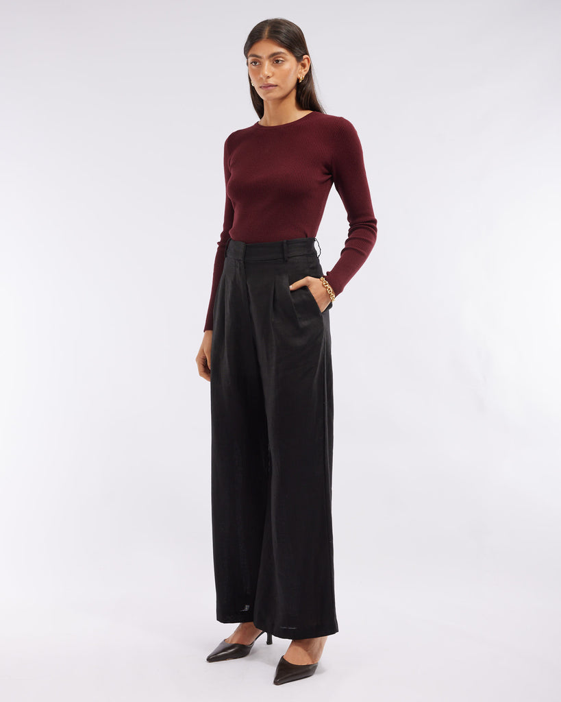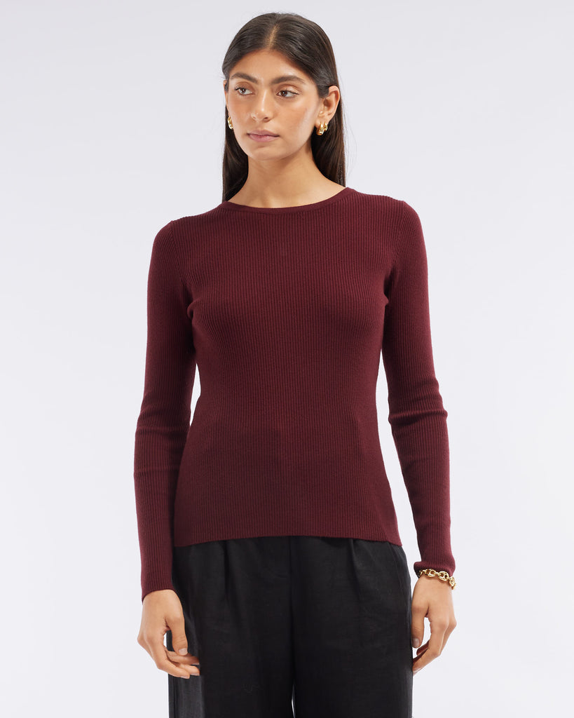 Elevate your foundational layers with the Afina Long Sleeve Knit Top. Crafted from a soft modal nylon blend, this slim-fitting knit features a round neckline, full-length sleeves, and fine ribbed texture throughout. A timeless essential designed for ease, warmth, and year-round versatility.