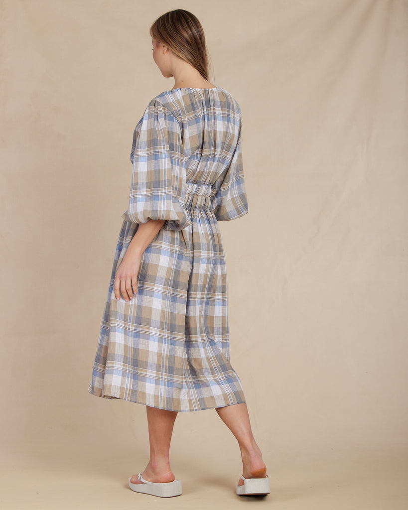 Elasticated puff sleeve dress with a tie neckline, blouson fit and flare shape. A garment that exudes simplicity and versatility for a range of transeasonal outings. Cool blue tones pair back easily with other natural textures such as wool, and worn with sandals or boots.