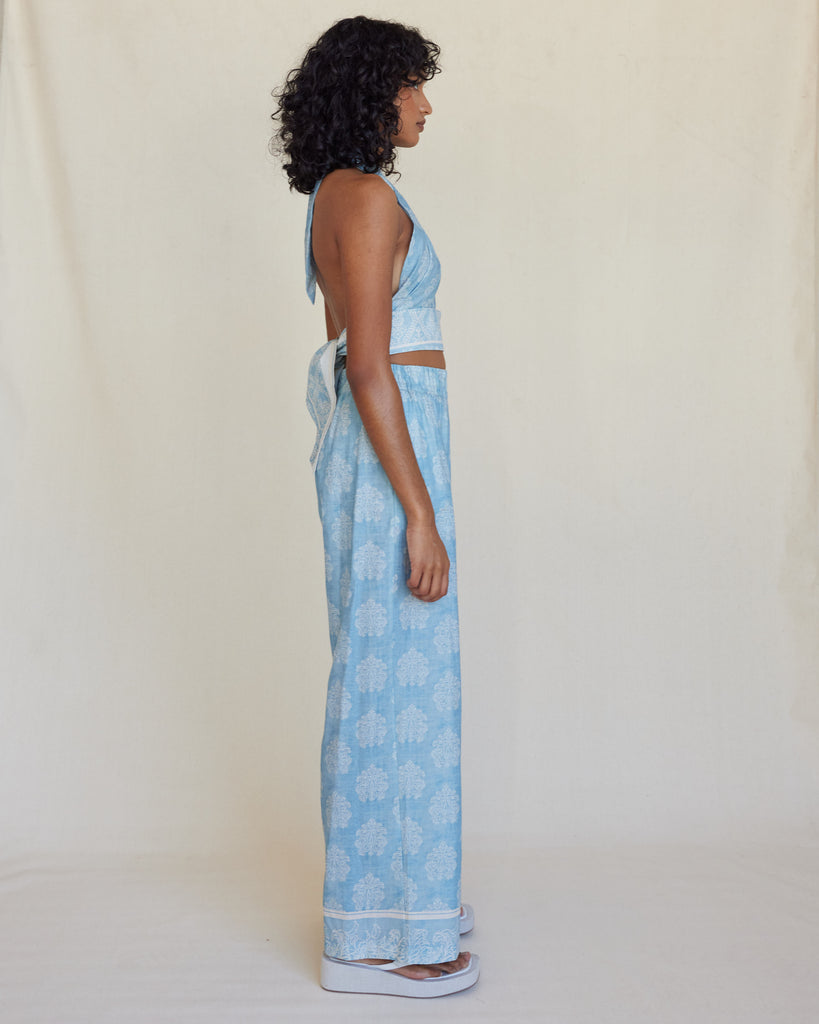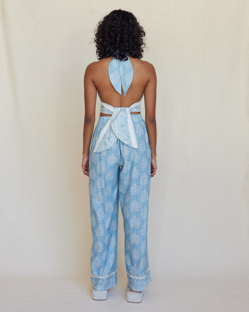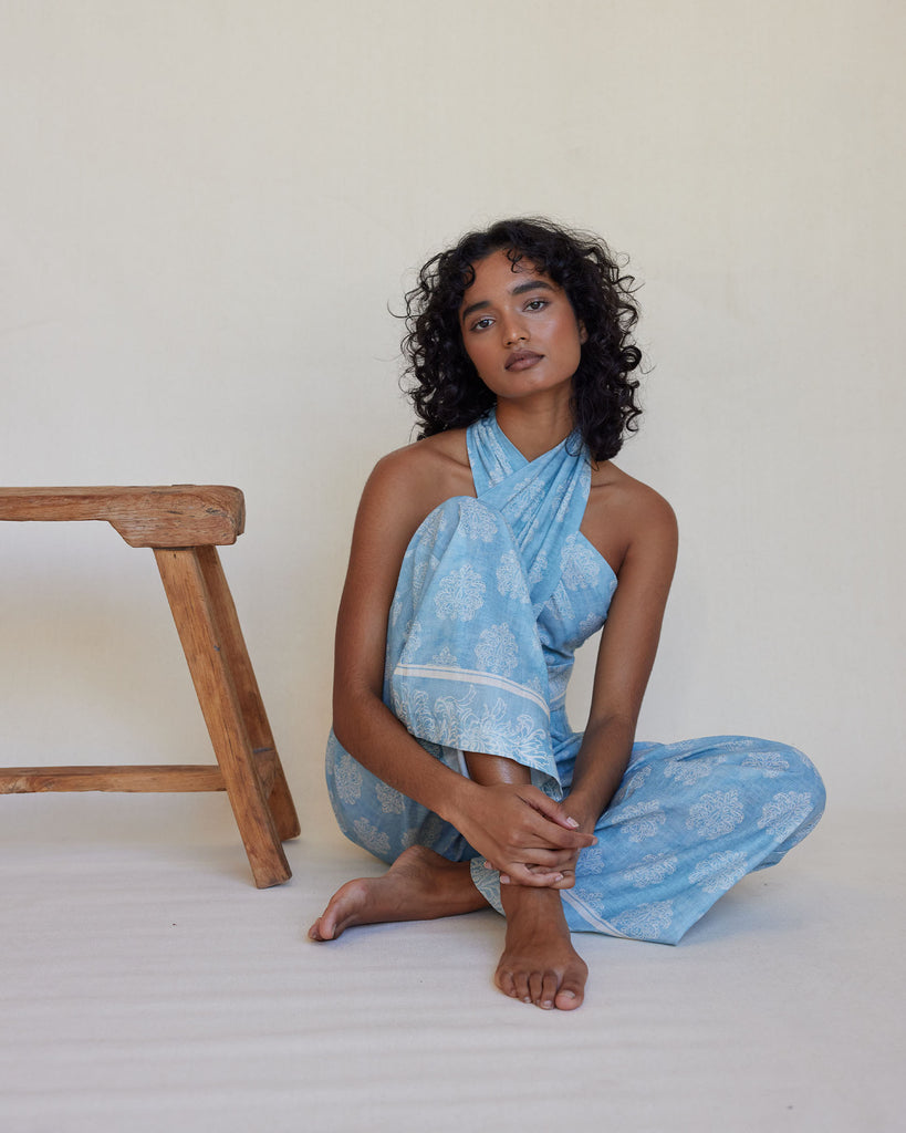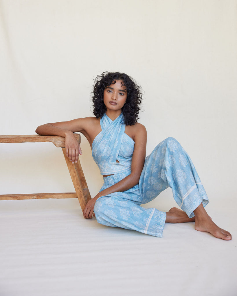 Featuring a classic woodblock print against a vintage wash sky blue, the Anjali Halter Top is a resort must-have, perfect for elevating your beachside outfit with nuanced detailing. Tied both at the neck and the high waist, the cross-over design allows for maximum tailoring to your shape.