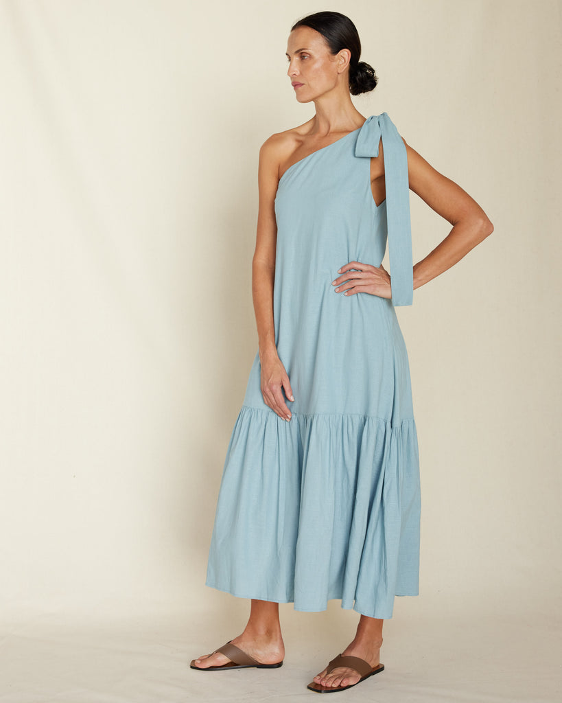 Aruba Linen One Shoulder Dress - Duckegg Blue