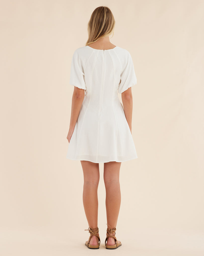 The Auguste Puff Sleeve Mini Dress is made from a breathable tencel linen blend, offering a fresh take on everyday dressing. Designed with a flattering V-neckline, puff sleeves with elastic cuffs, and a softly flared mini-length skirt. Side pockets add practicality to this versatile style.