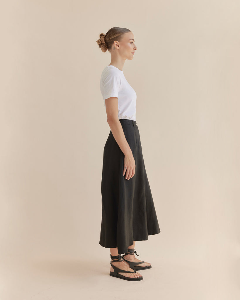 A closet staple, the Barossa Linen Skirt is a classic piece worn all year round. Made from 100% linen fabrication, the midi-length skirt features side pockets and a button closure. Style with a basic top and your favourite shoes for any occasion.