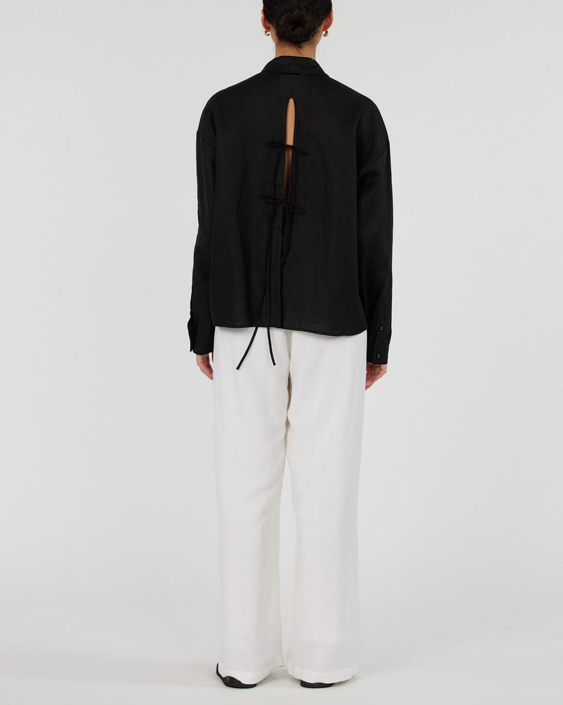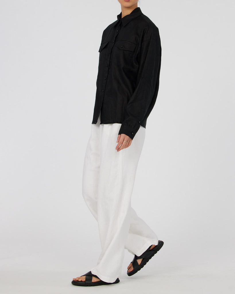With its oversized fit and open back, the Byron Linen Overshirt boasts a modern yet refined appeal. Crafted from our signature pure linen, a neat collar complements the double breast pockets and is finished with classic shirt sleeves. Adorned with self-covered buttons and back ties, this overshirt is perfect for transeasonal layering.