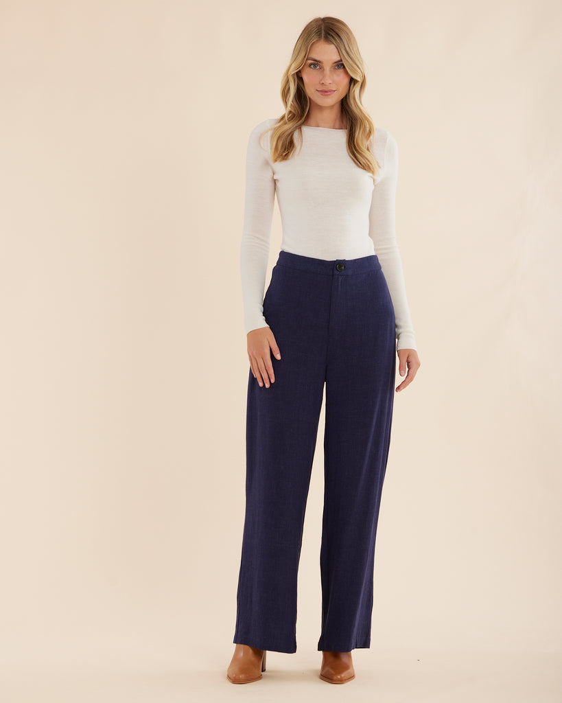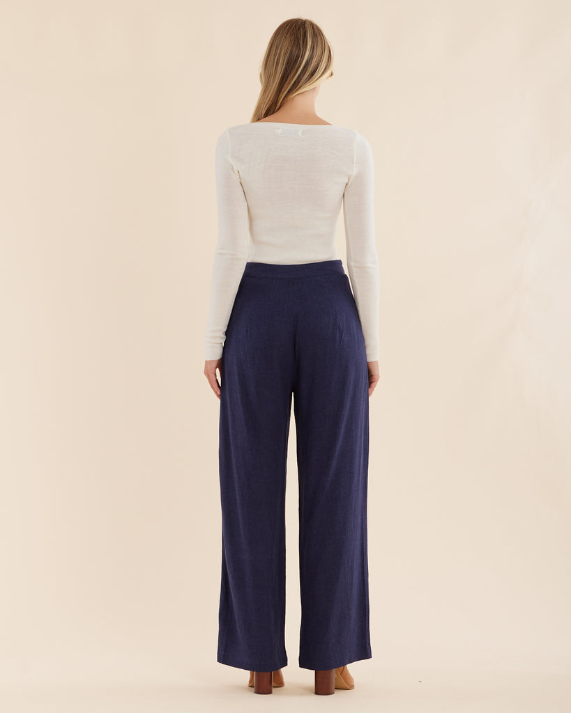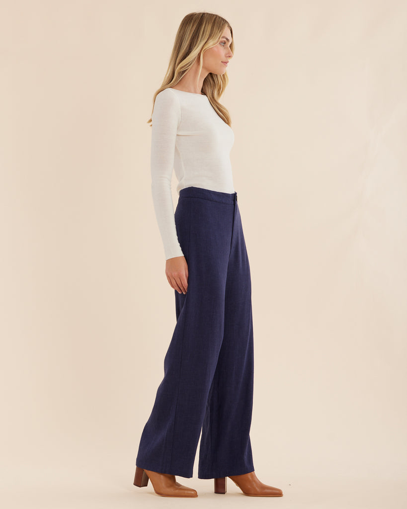The Chelsea Straight Leg Pant is tailored from a breathable linen-rayon blend, offering a polished yet relaxed silhouette. Designed with a high-rise waist, full-length straight leg, and a zip fly with button closure. Dual back pockets add a practical finish to this everyday essential.