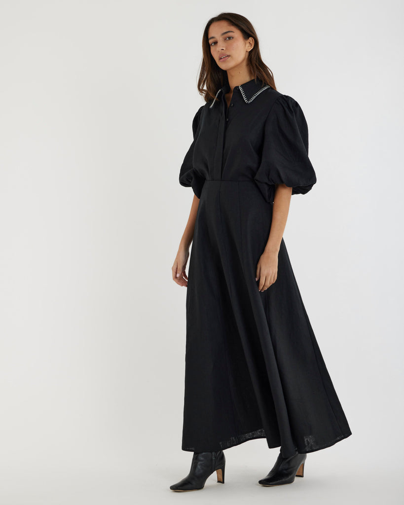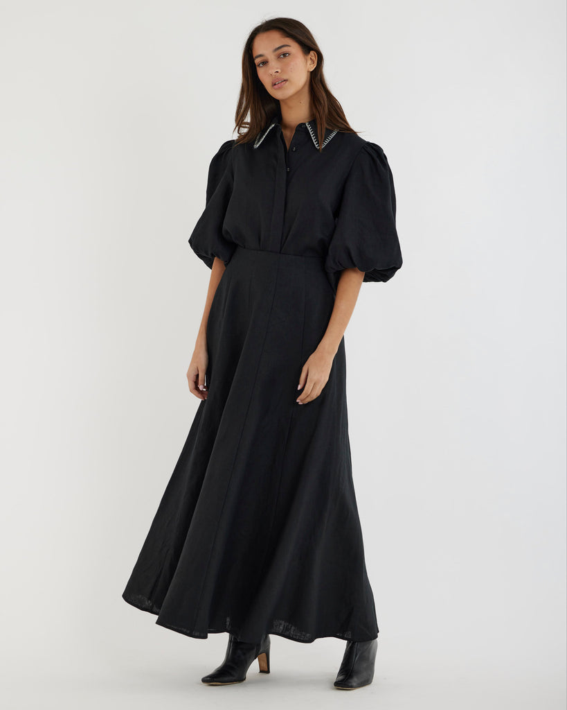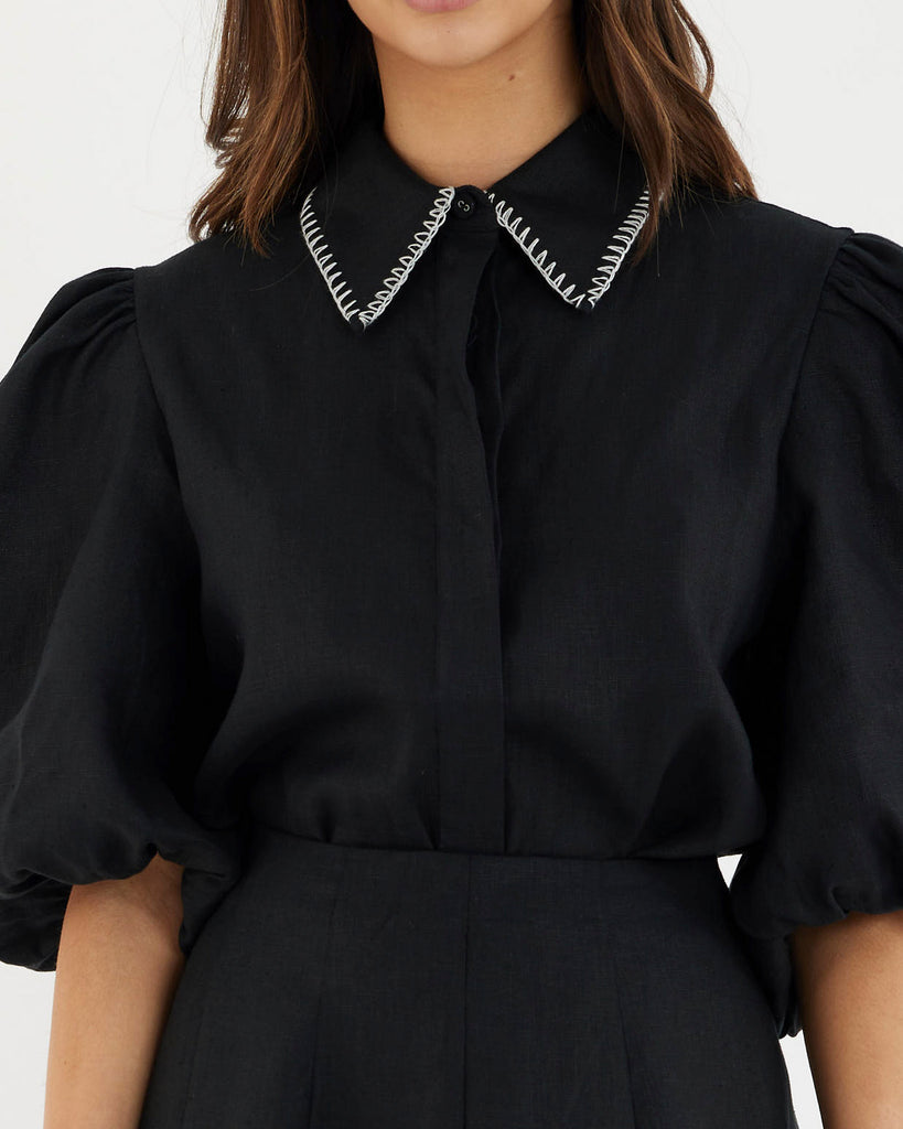 The Chloe Stitch Detail Linen Shirt is a fusion of classic charm and contemporary flair. Crafted from luxurious 100% linen, this shirt features a collared neckline and exquisite contrast stitching details. The puff sleeves add a touch of romance, while the elasticated cuffs and concealed placket provide a tailored fit.