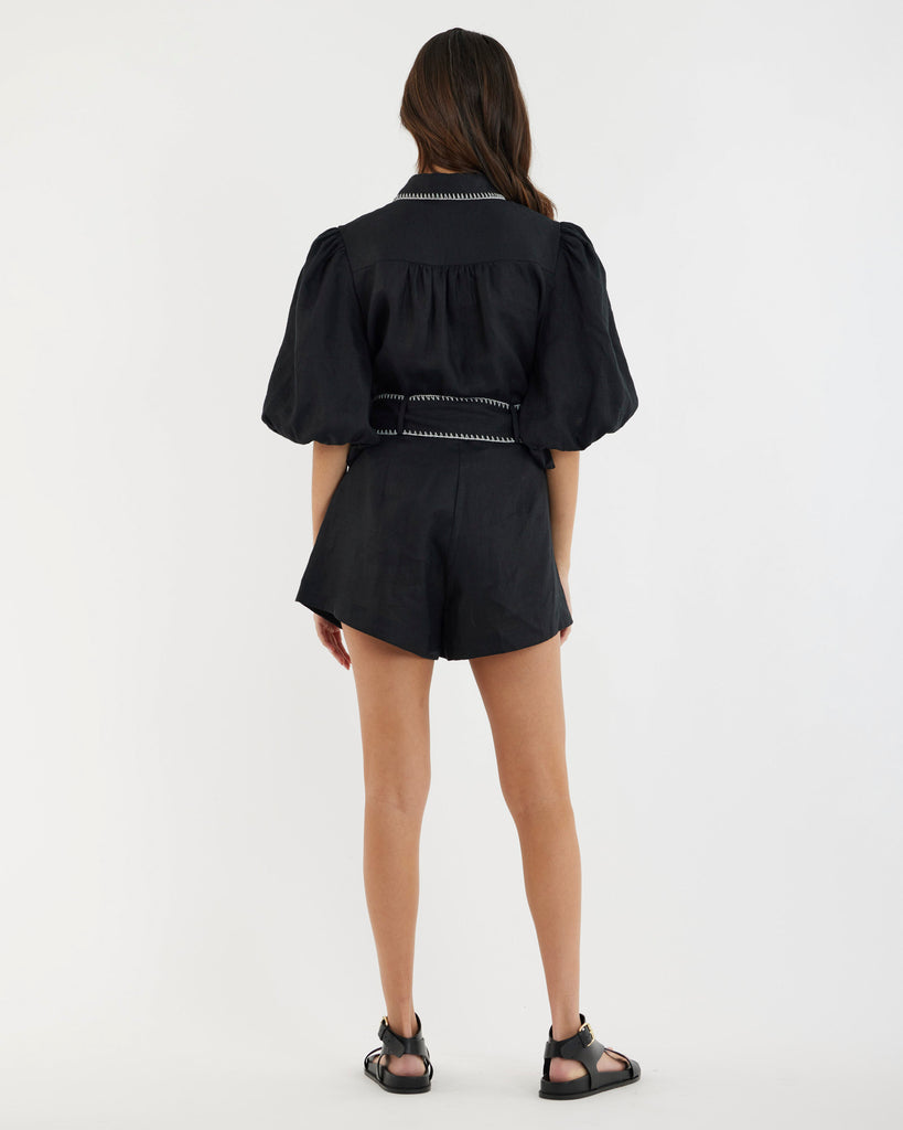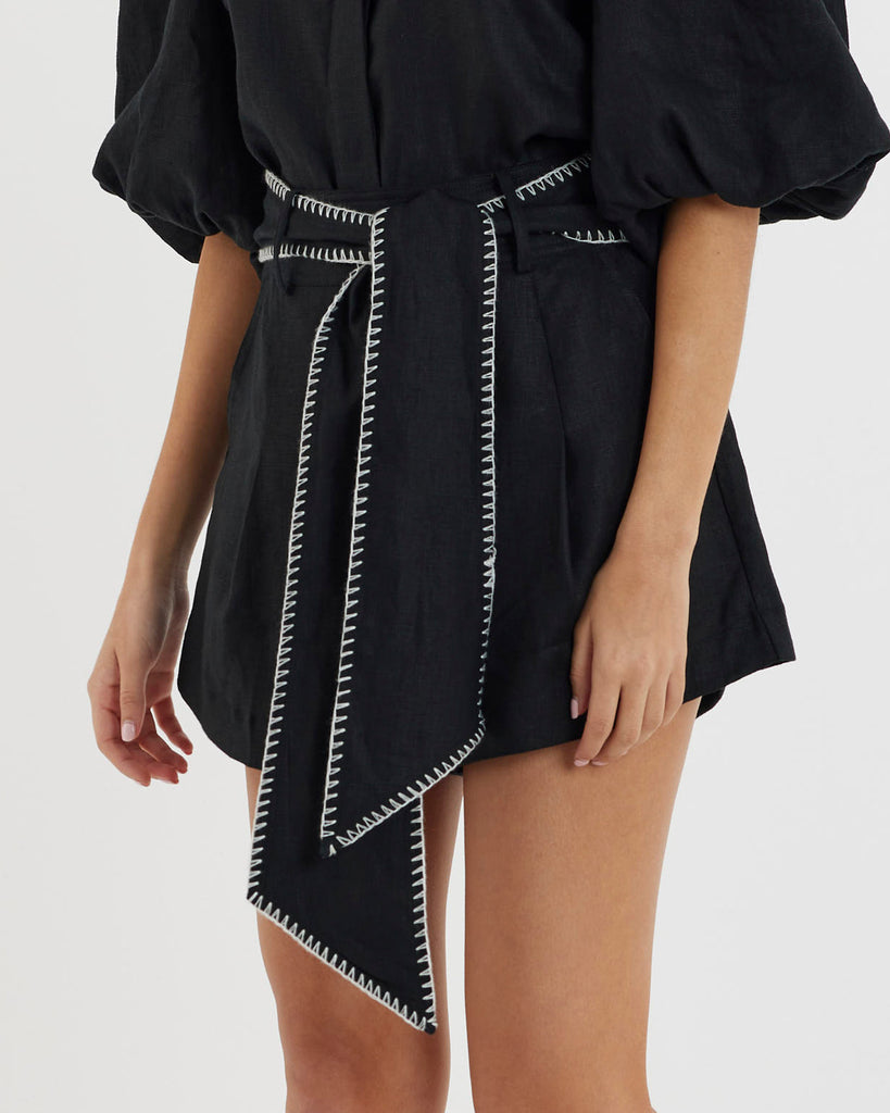 Introducing the Chloe Stitch Detail Linen Short. Crafted from 100% linen, these shorts captivate with a distinguished contrast stitching detail adorning the belt tie. The side zip closure ensures a seamless fit, allowing the refined detailing of the belt to take center stage.