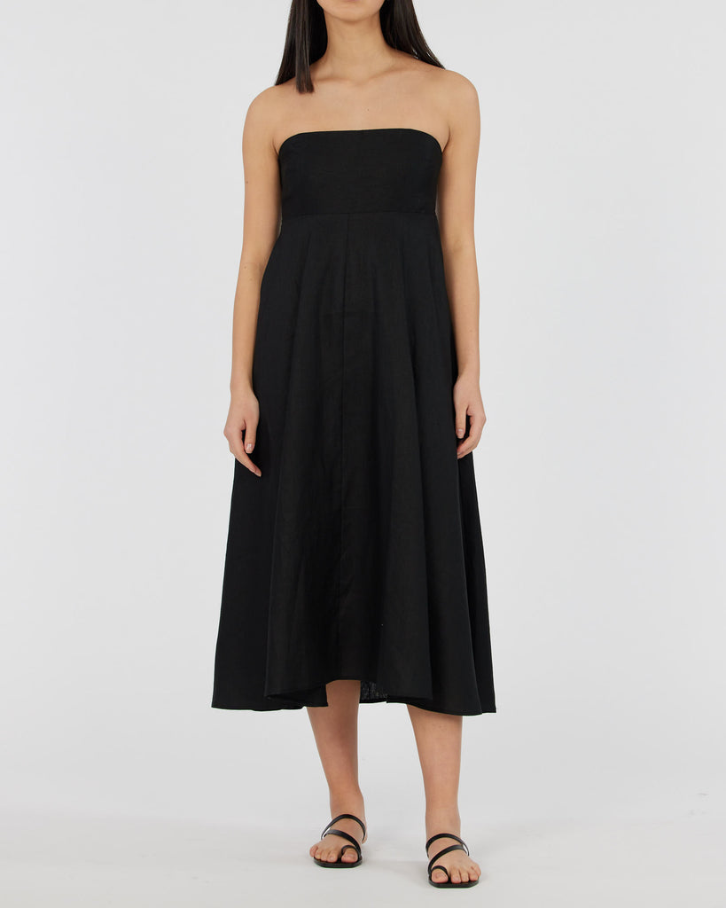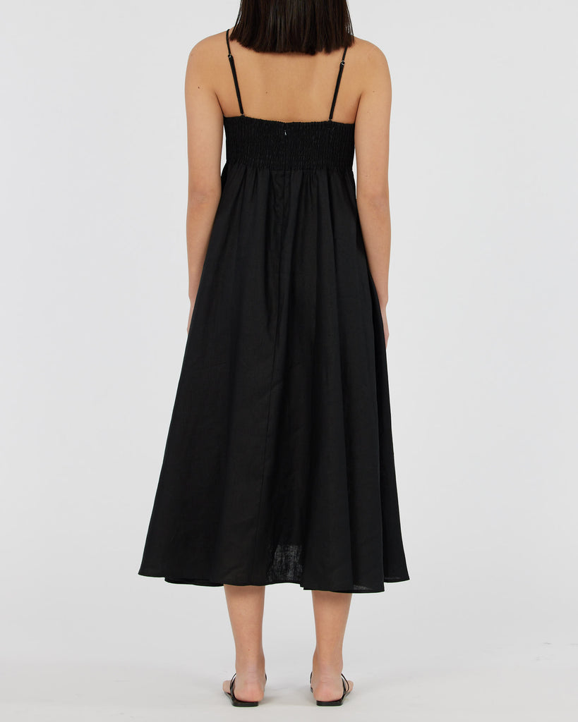 From daytime luncheons to captivating sunset moments at your best friend's wedding, the Corinna Linen Midi Dress exudes timeless refined beauty and effortless style. Crafted from high-quality 100% linen, this dress is perfect for embracing the season's allure. The midi length and A-line shape create a graceful silhouette, while the shirred back and invisible zipper ensure comfort and a seamless fit. With thin adjustable and removable spaghetti straps, this dress offers versatility and elegance.