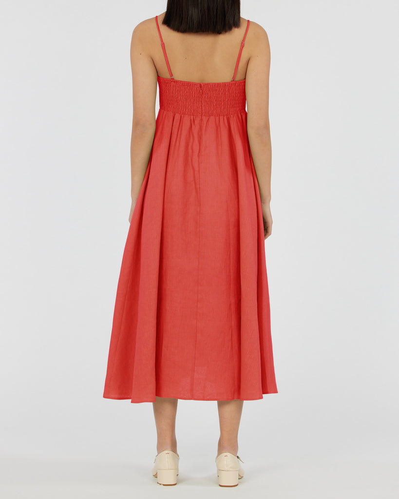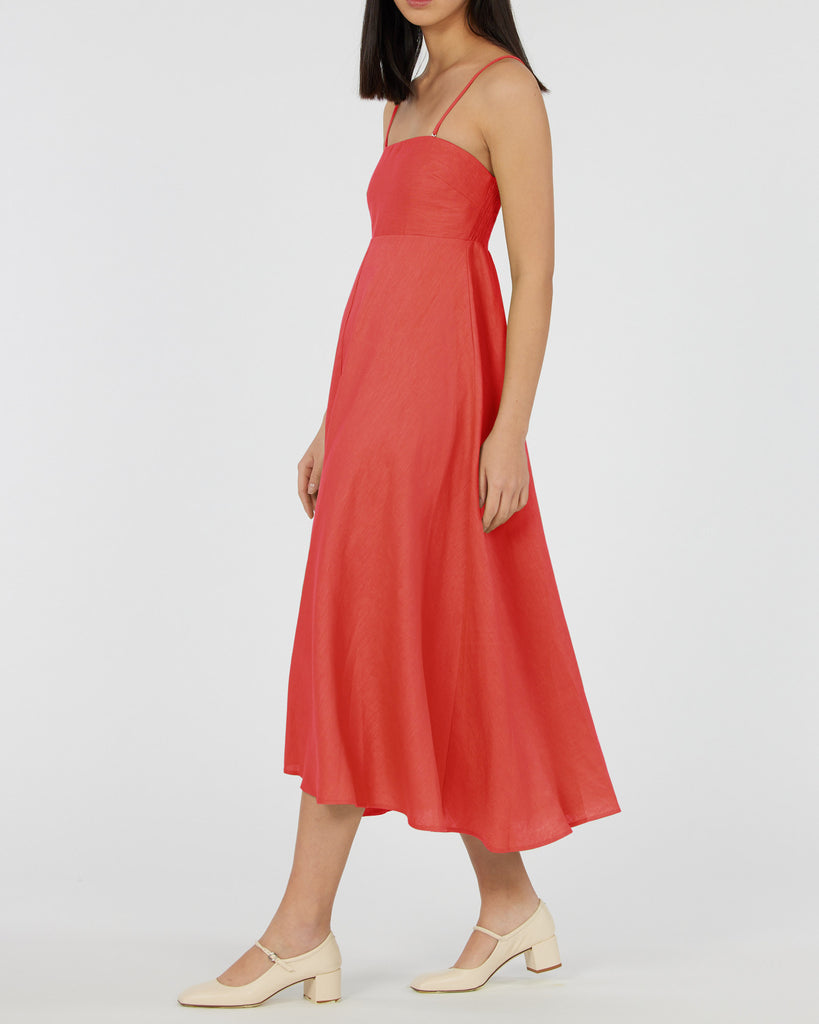 From daytime luncheons to captivating sunset moments at your best friend's wedding, the Corinna Linen Midi Dress exudes timeless refined beauty and effortless style. Crafted from high-quality 100% linen, this dress is perfect for embracing the season's allure. The midi length and A-line shape create a graceful silhouette, while the shirred back and invisible zipper ensure comfort and a seamless fit. With thin adjustable and removable spaghetti straps, this dress offers versatility and elegance.