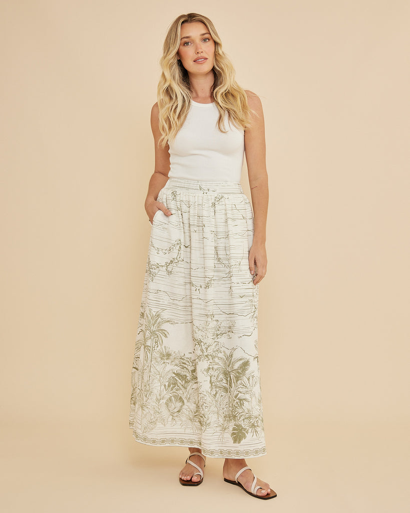 Introducing our Eden Maxi Skirt – a graceful statement piece in our signature vintage wallpaper palm print, featuring sage green palms artfully placed on a crisp white linen blend. This flowing design features a comfortable elasticated waistband for effortless wear, while the strategic placement of the print creates visual intrigue. The lightweight linen-blend is perfect for warm-weather occasions and pairs back easily with our linen jersey basics for an every day look.