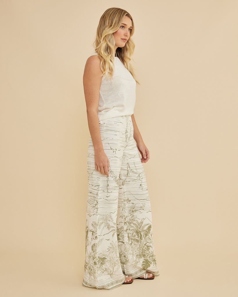 Introducing our Eden Wide Leg Pant – a sophisticated statement piece in our signature vintage wallpaper palm print, featuring sage green palms on a crisp white linen blend. This striking design is tailored to fit through the waist before flaring at the leg, creating an elegant silhouette. The hidden side zip ensures a sleek finish, while the lightweight linen-blend construction provides breathability and beautiful drape for effortless sophistication.
