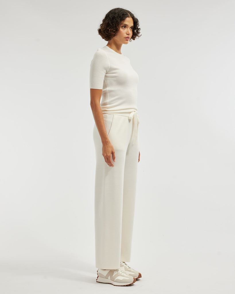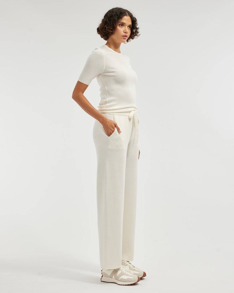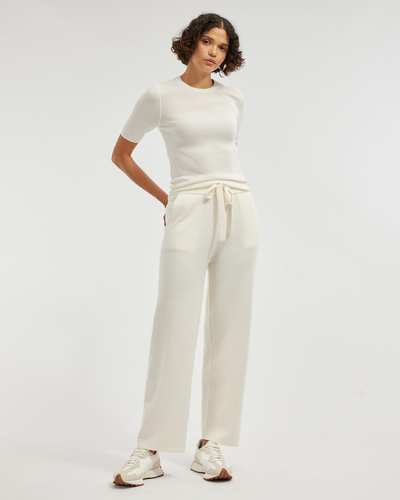 Introducing the Elsie Merino Knit Pant, where style meets ultimate comfort. Crafted from 100% Merino Wool, these knitted pants provide luxurious softness. Featuring a straight leg, adjustable waist strings, and dual side pockets, they offer a perfect fit and everyday elegance.