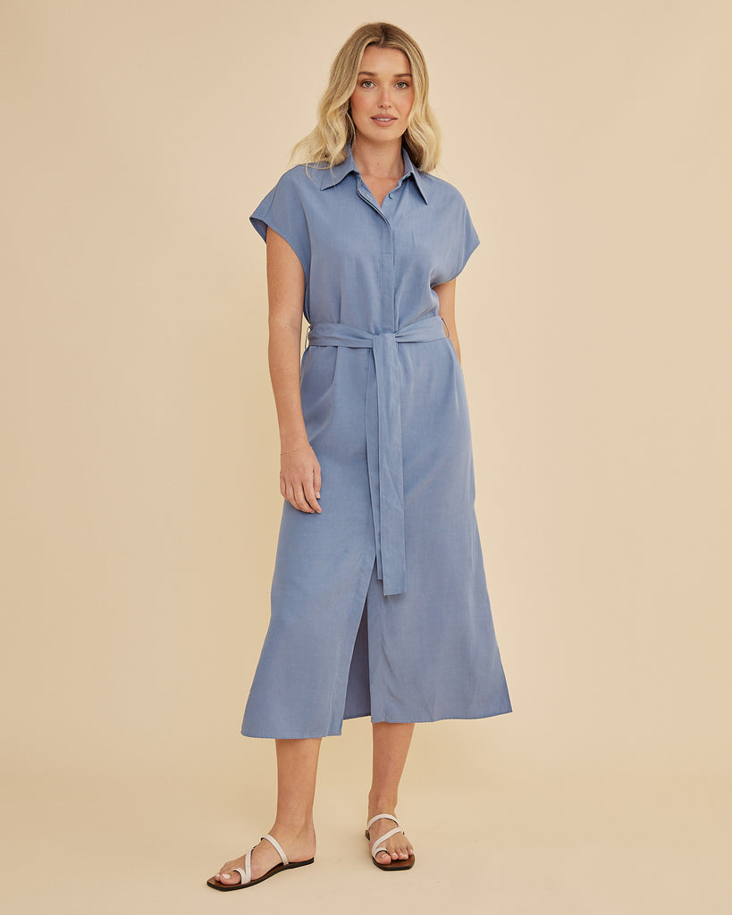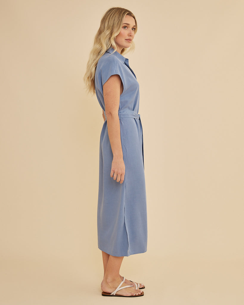 Introducing our Frankie Column Dress – a sophisticated silhouette crafted with timeless elegance. This polished design features feminine cap sleeves and a refined collar, while the hidden button placket creates a sleek, uninterrupted line. The self-fabric waist tie allows for a customized fit, defining your silhouette with grace. A full lining ensures smooth draping and comfort throughout the day.