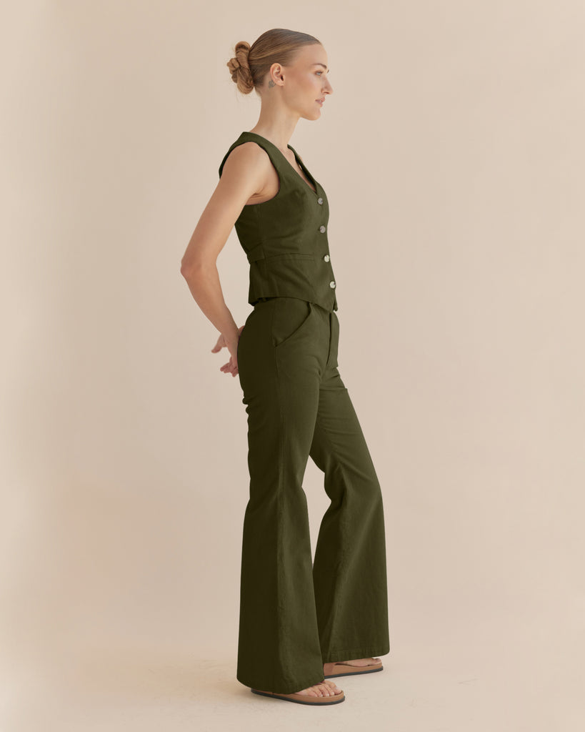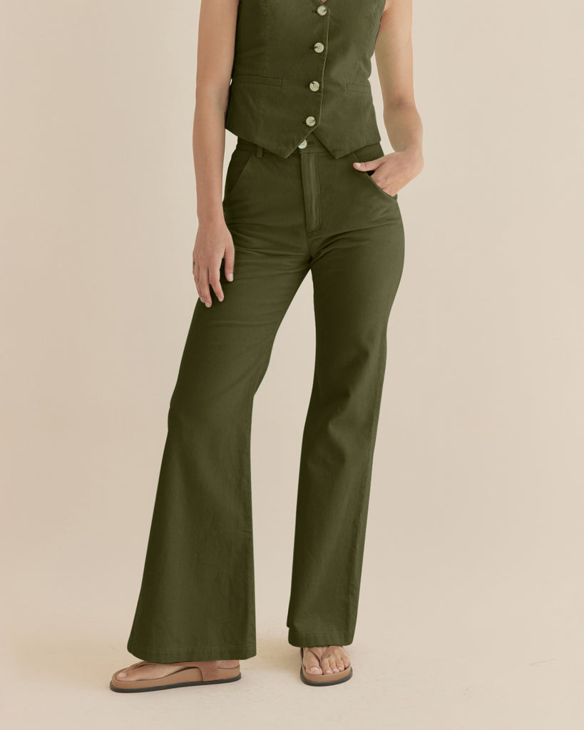 The Giovanna Corduroy Pant presents a sleek, structured silhouette with a chic flared leg. Crafted from soft corduroy, these trousers combine comfort with elegance, making them a versatile staple for transitioning seamlessly from day to night.