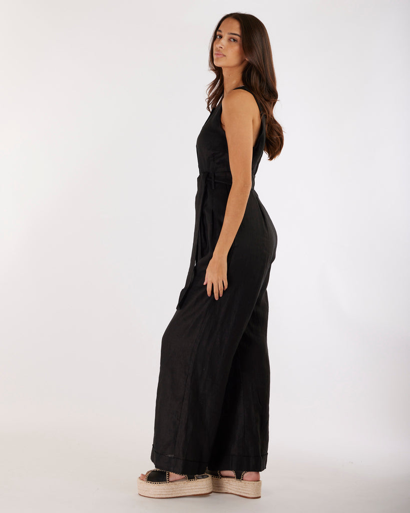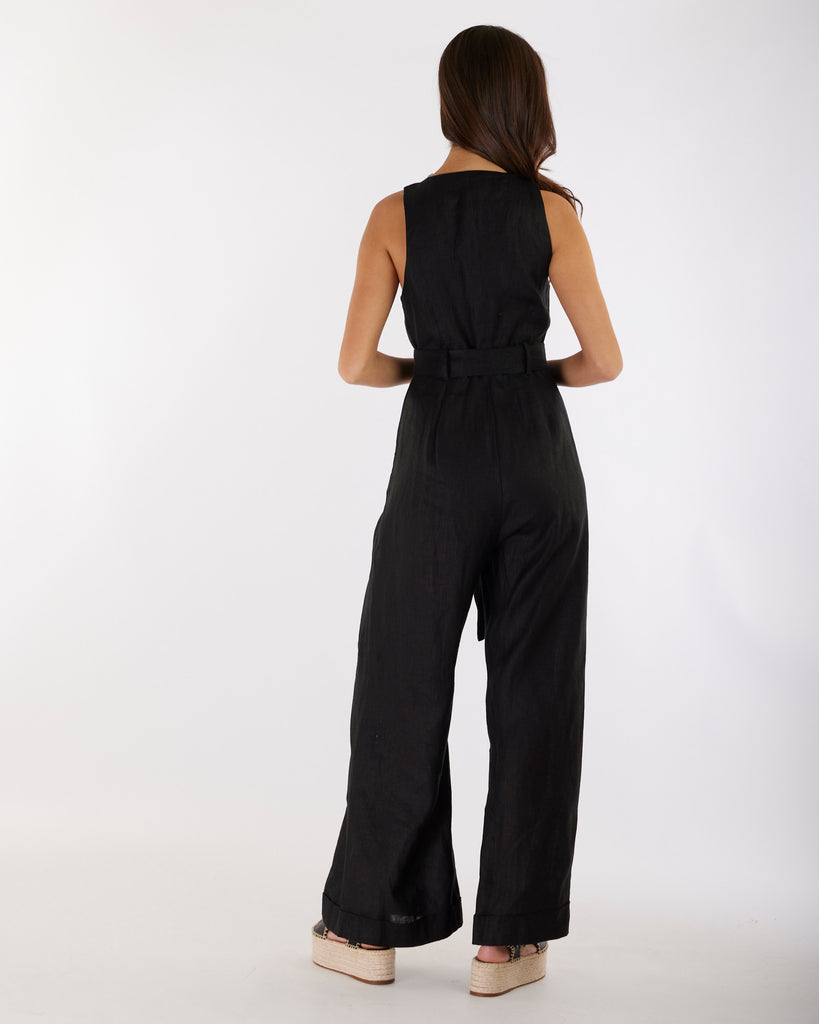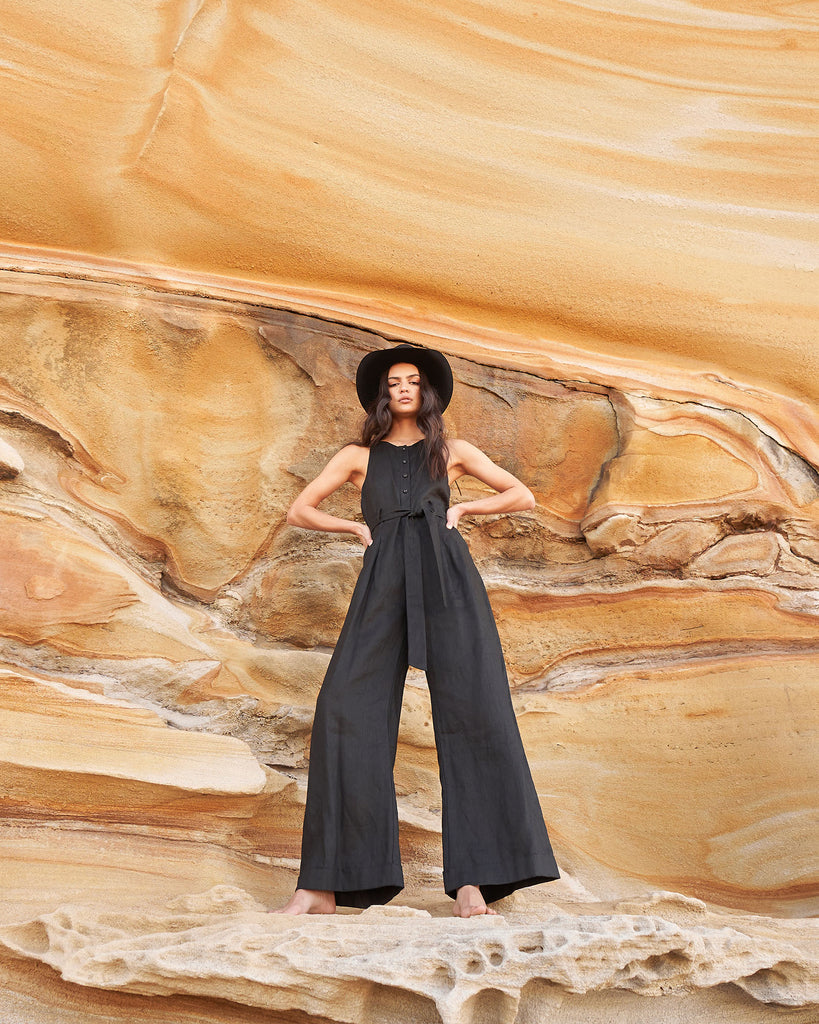 From timeless simplicity and versatility, the Imari Linen Jumpsuit by was designed to be worn in high rotation this Summer. Crafted with a luxurious 100% linen fabrication, this sleeveless and breathable jumpsuit features buttoned front detailing, dual side pockets, a relaxed wide leg cut and a removable self-covered tie belt to accentuate the waist. Style this piece for any occasion this season.