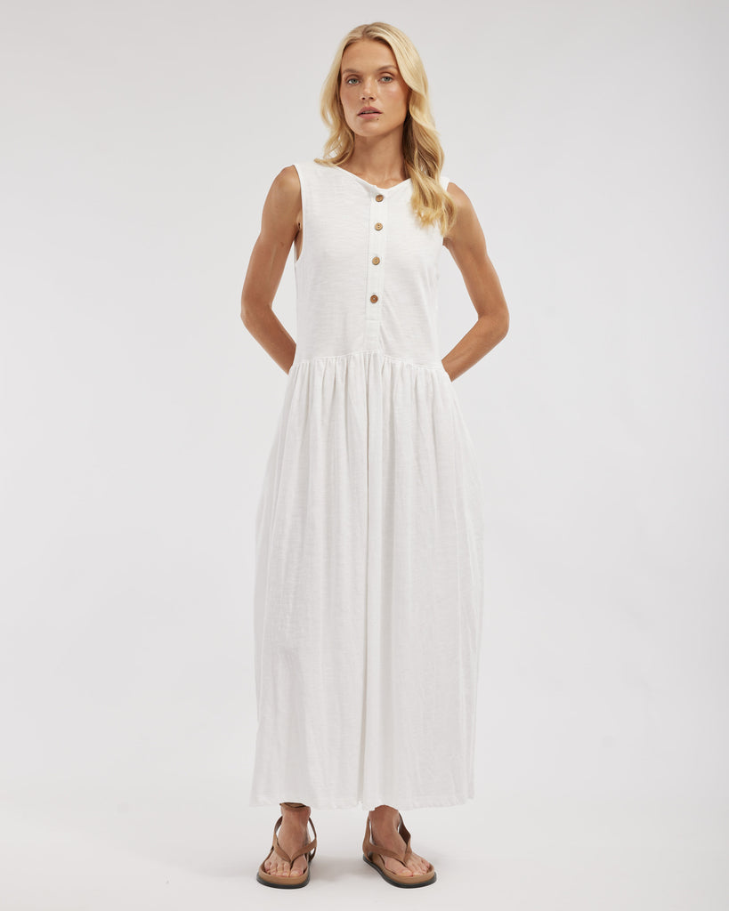 The Jacki Reversible Maxi Dress by Amelius offers two looks in one with its versatile design. Crafted from soft 100% organic cotton, it features a sleeveless silhouette, gathered waist, and a button-down or scoop-neck option. A flowing maxi length adds elegance to this everyday staple.