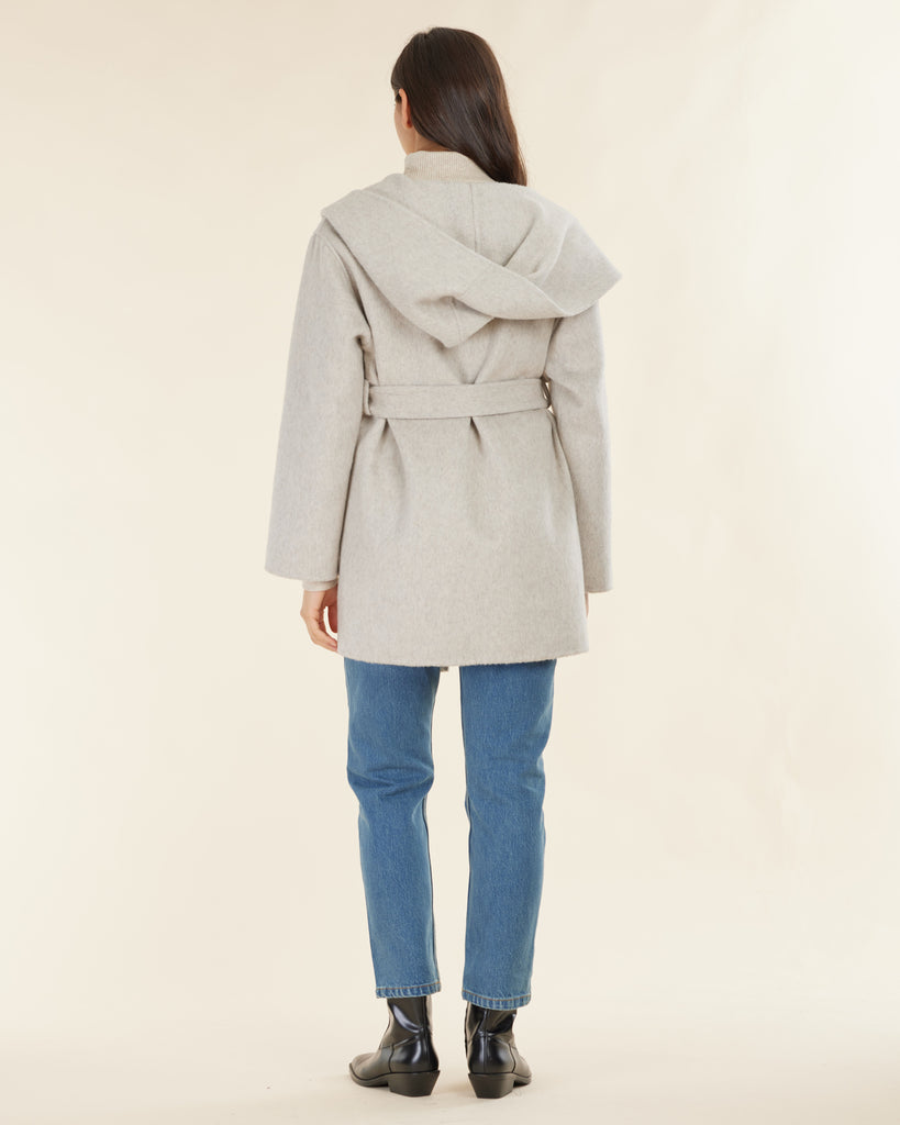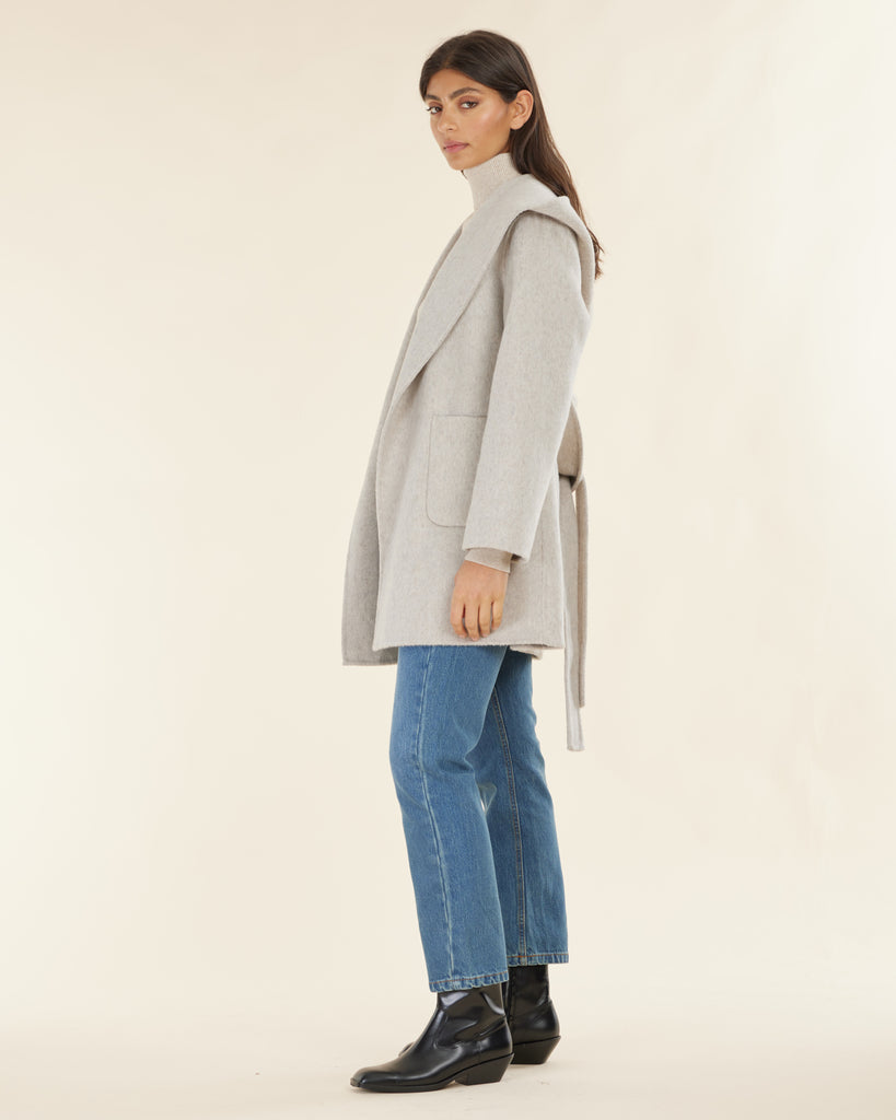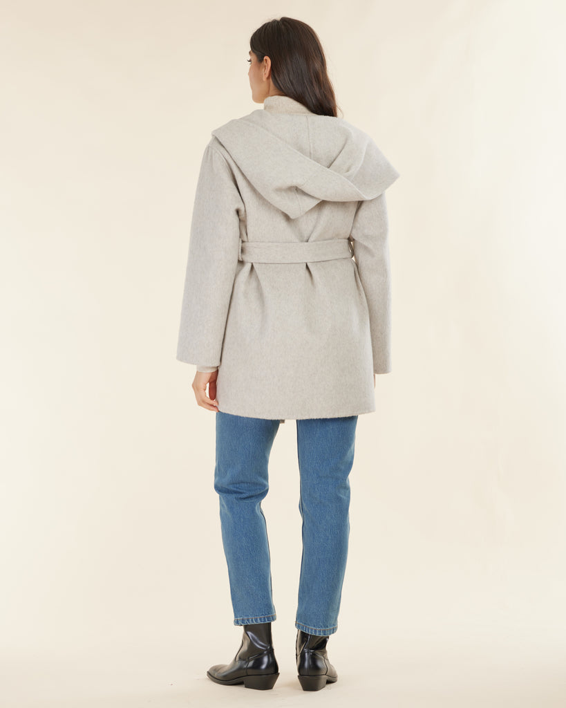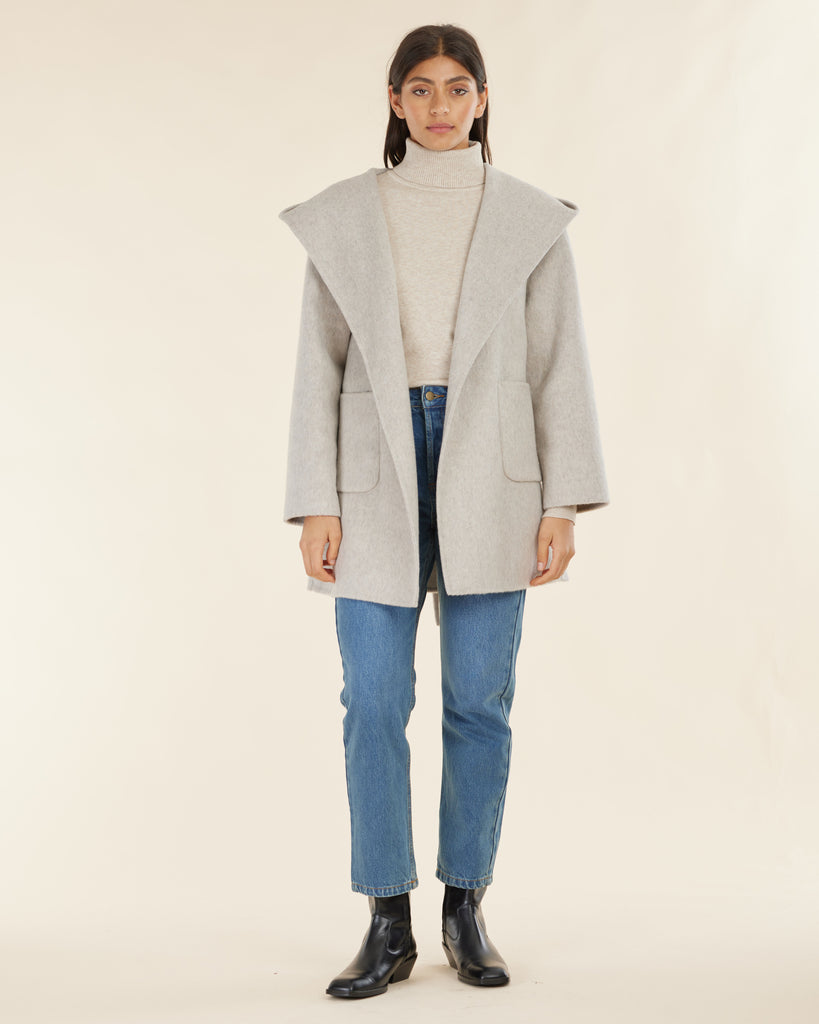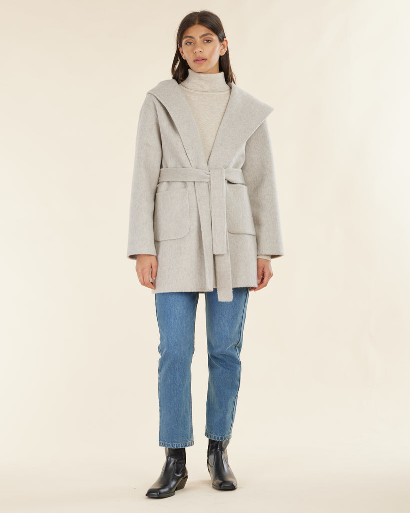 The Kamara Wrap Wool Coat blends structure and softness in a shorter, more relaxed silhouette. Crafted from 100% Australian wool, it features a generous hood, oversized patch pockets, and a self-tie belt for optional definition. Ideal for layering through the cooler months, it offers comfort, warmth, and clean lines in equal measure.