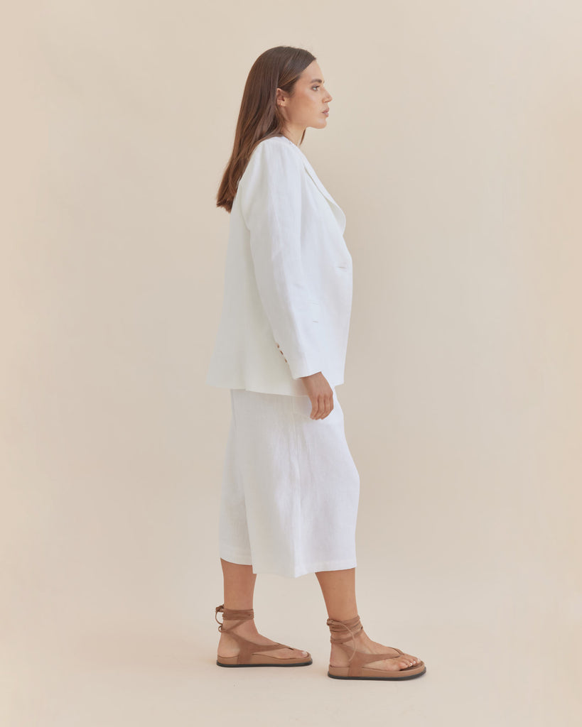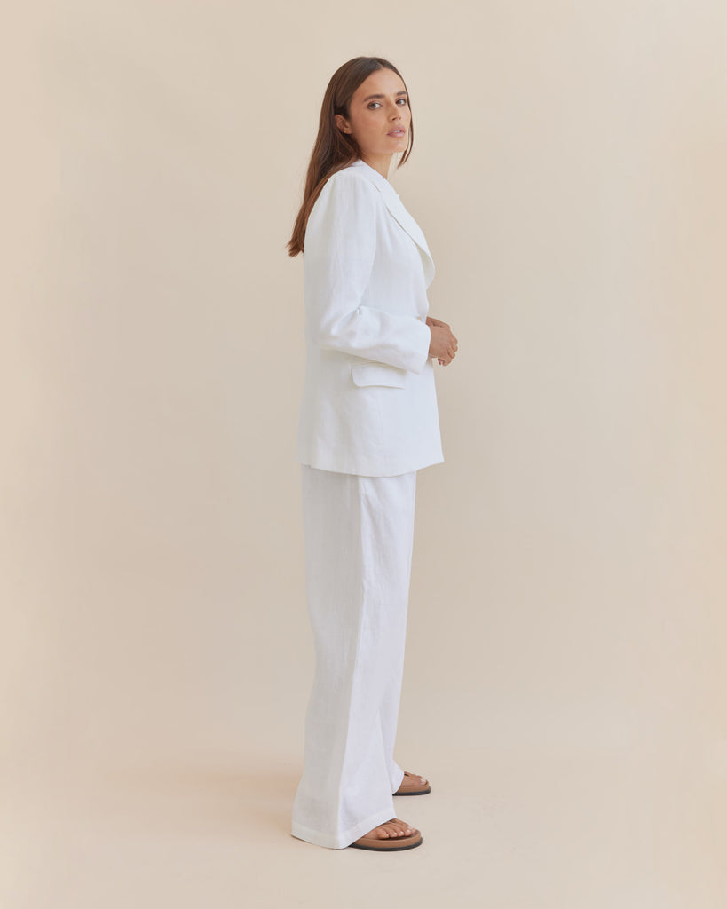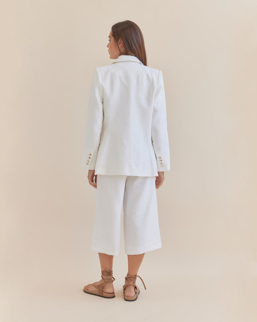The Katrina Linen Blazer exudes timeless sophistication, crafted from 100% linen for a lightweight yet structured look. This versatile piece features a tailored fit and classic lapels, perfect for adding a touch of elegance to any ensemble, whether dressed up or down.