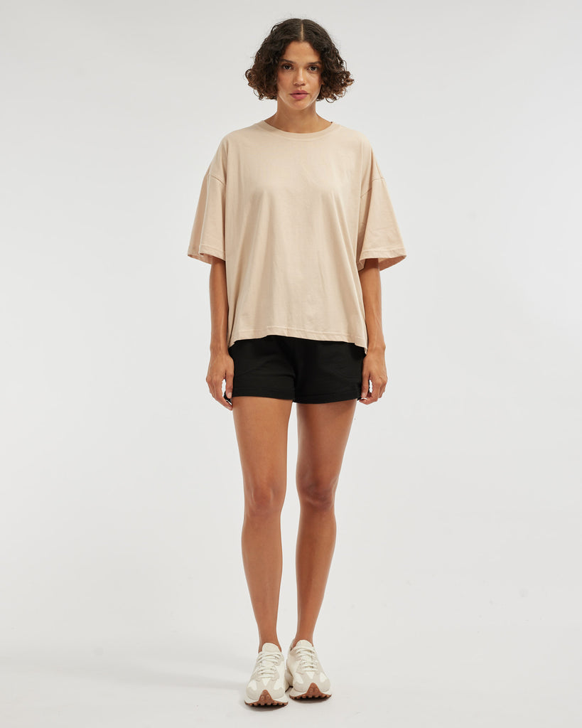 The Leah Boyfriend Tee delivers a relaxed, oversized fit with a softly draped silhouette. Crafted from breathable cotton, it features a wide crew neckline, dropped shoulders, and a straight hem for a laid-back appeal.
