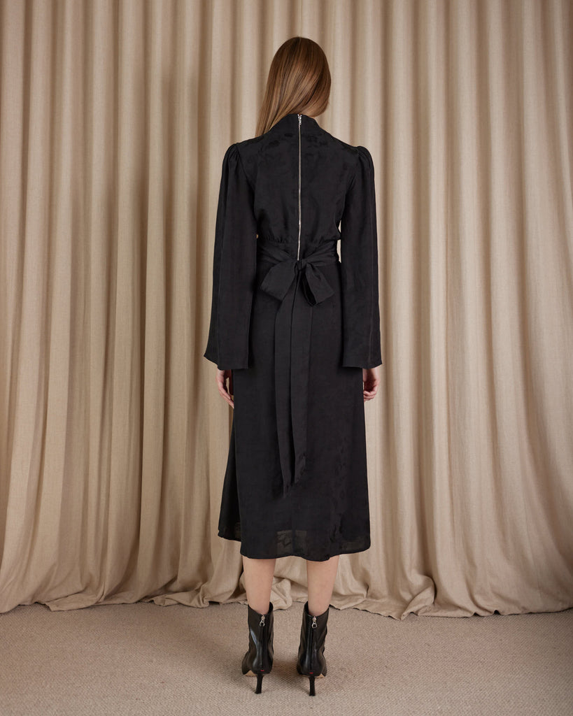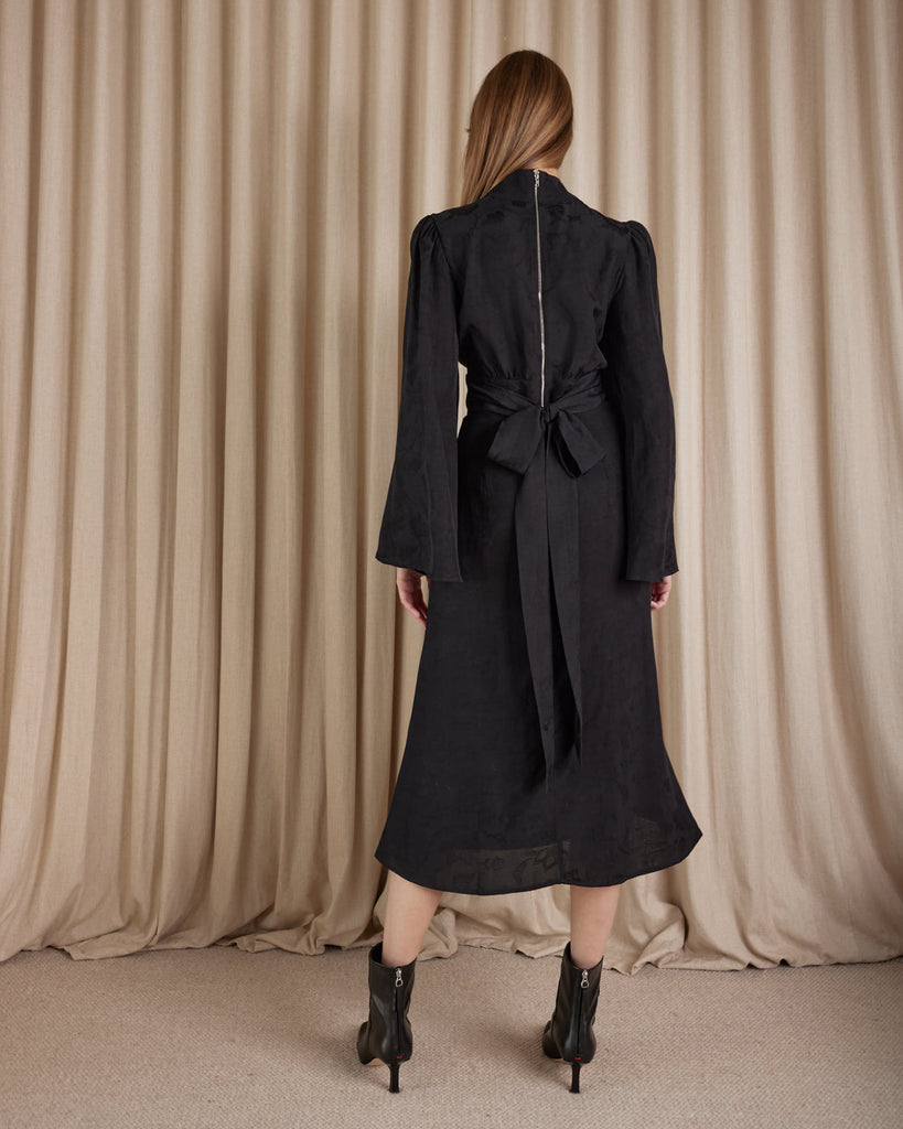 An elegant crop featuring dramatic full-body fluted sleeves, a sophisticated mock neck and a waisted belt tie in a crop length, the Loren Linen Jacquard High Neck Blouse was designed to match back with deep indigo jeans, the matching skirt or our Elvie and Bridgette Pants. It boasts a silky linen jacquard fabrication adorned with subtle motif that elevates any outfit.