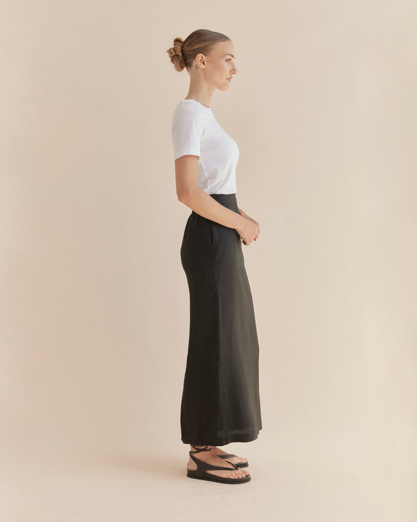 Playing sister to our Mabel Linen Pant, the Mabel Linen Skirt has a modern and minimalist take on the classic linen skirt. Crafted from 100% linen, this skirt has a flattering high-waisted fit and stretchy elastic waistband for ultimate comfort. The practical dual side pockets and midi-length add an effortless charm to your wardrobe and make it an ideal choice for both formal and casual occasions.