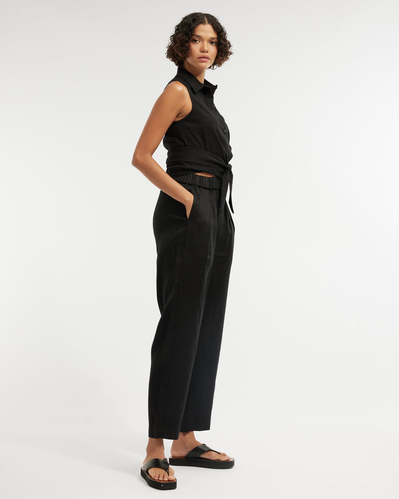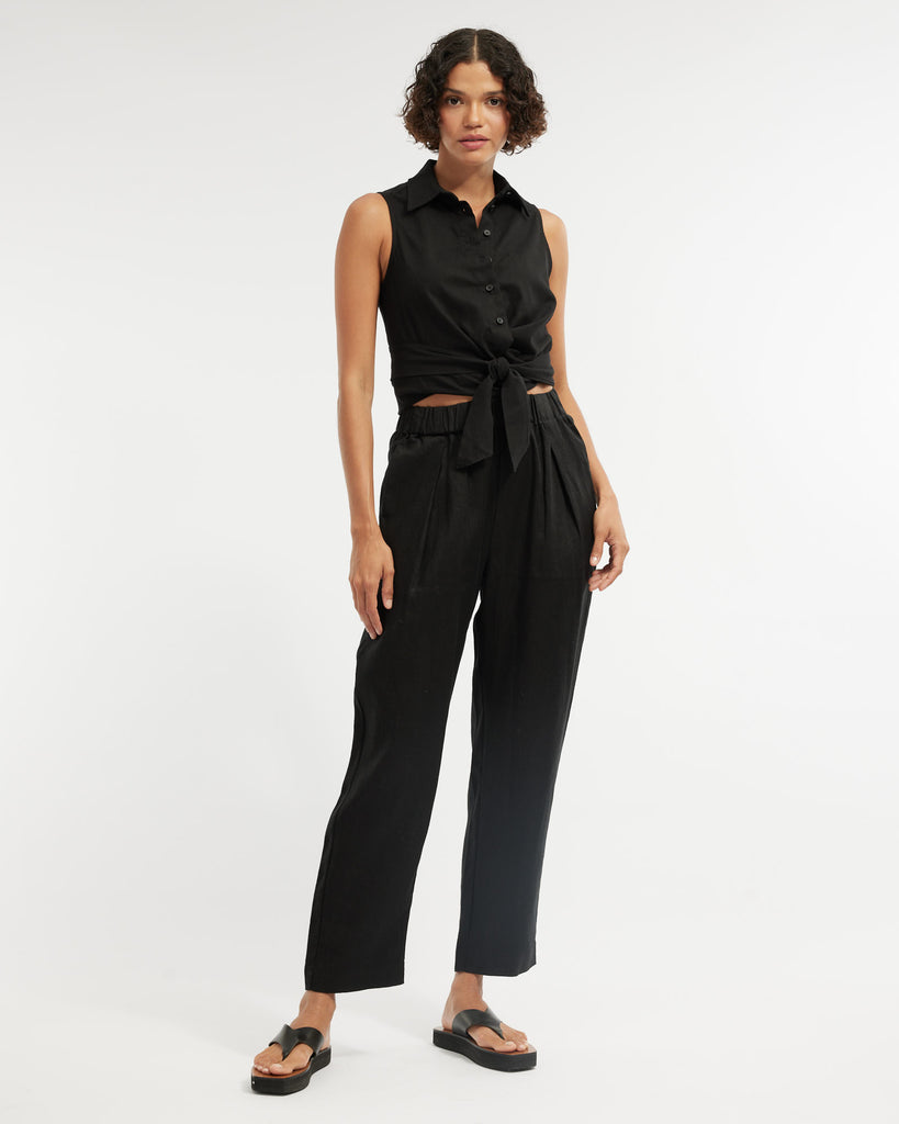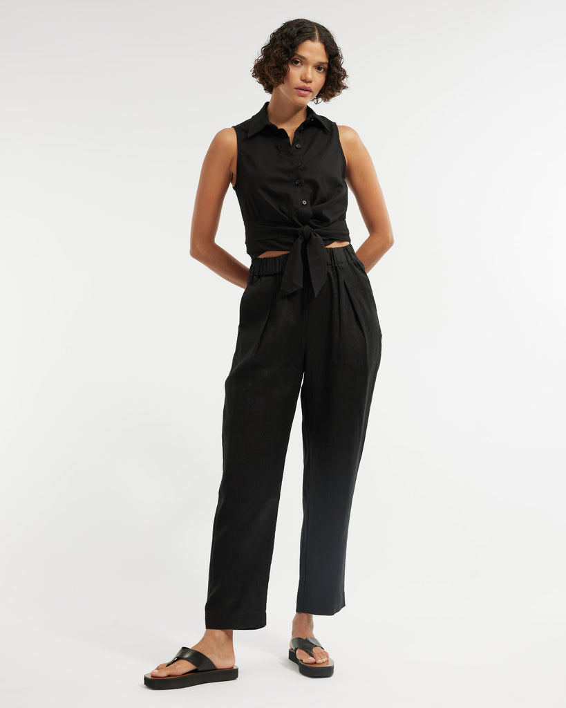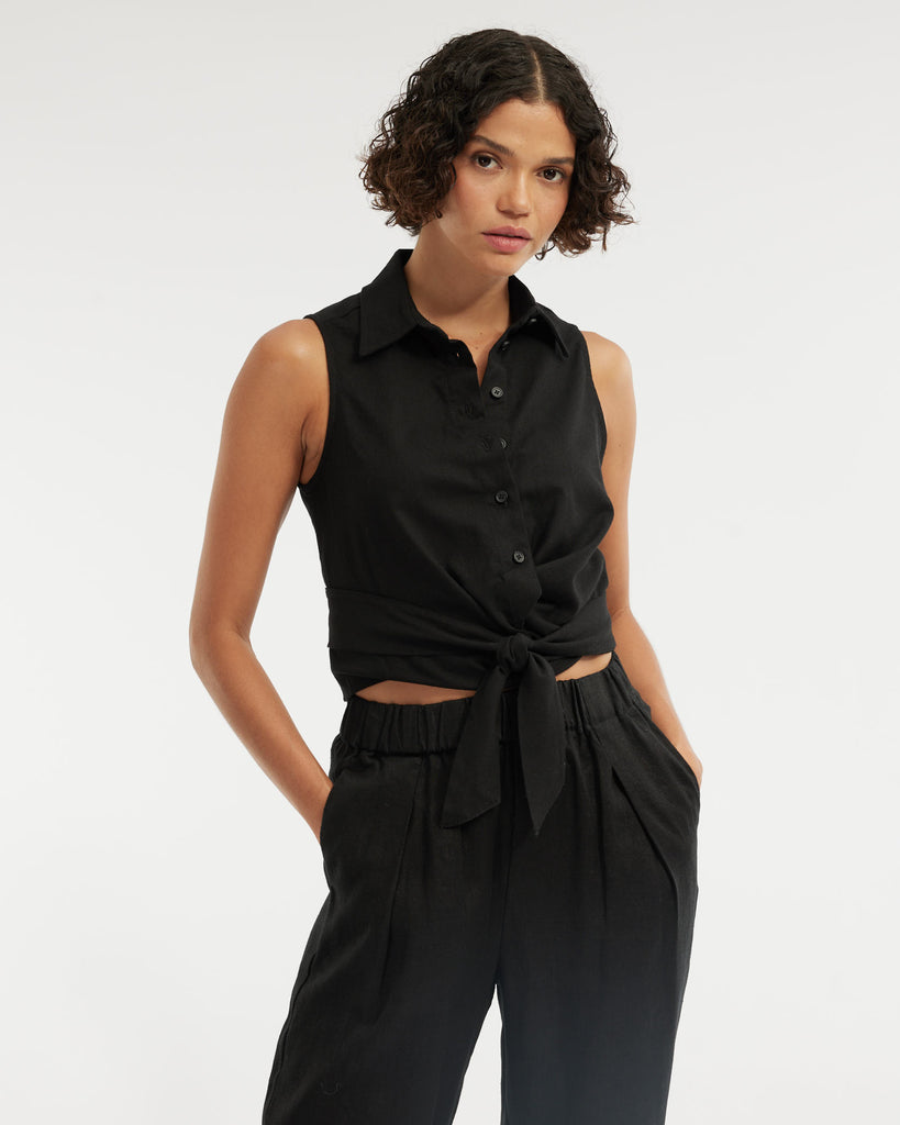 Introducing our Naomi Wrap Crop Shirt – a contemporary piece crafted from a breathable viscose linen blend. This distinctive design features a sleeveless silhouette and innovative wrap front that pulls through for an adjustable fit. The cropped length creates modern proportions, perfect for pairing with high-waisted pieces.