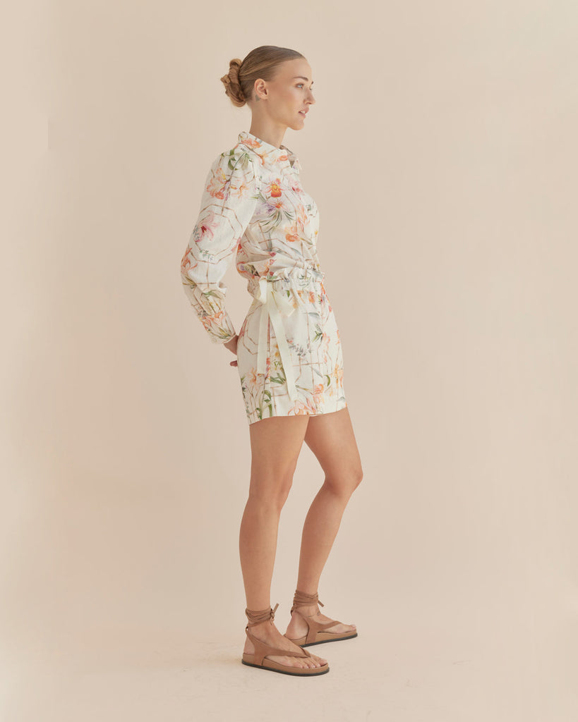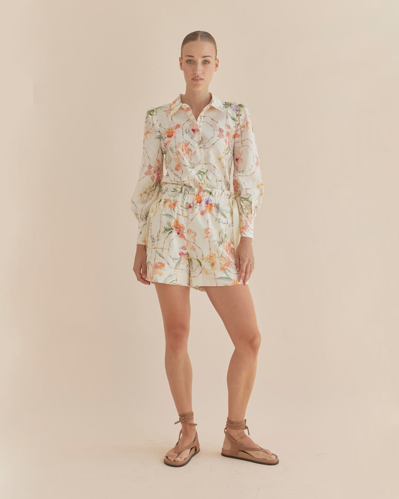 The Orangerie Bow Detail Short brings a touch of playful elegance to your wardrobe. Crafted from a luxurious linen-viscose blend, these shorts feature a vibrant floral print and a charming bow detail at the waist, perfect for adding a feminine flair to any look.
