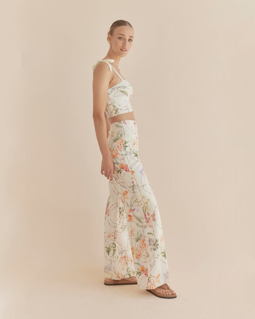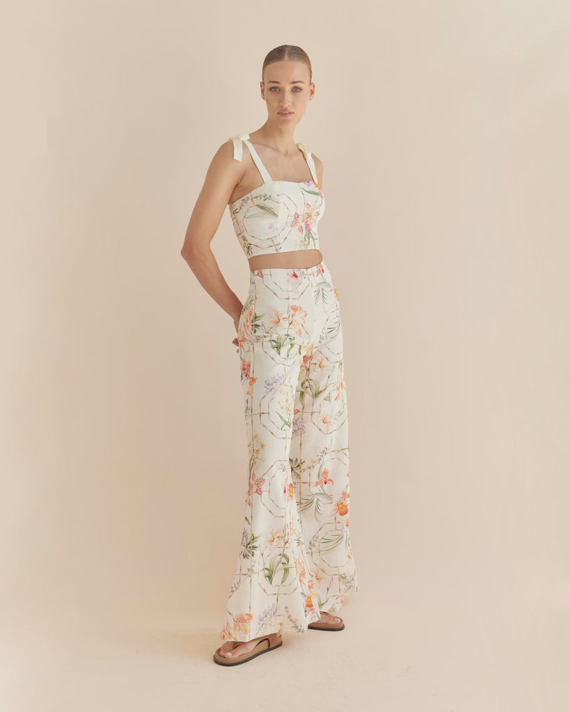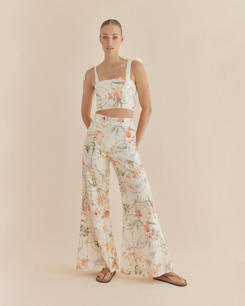 The Orangerie Crop Top is a charming and versatile piece, made from a luxurious linen-viscose blend. This top features delicate tie straps, a fitted bodice, and a vibrant floral print, perfect for pairing with high-waisted bottoms for a fresh, summery look.