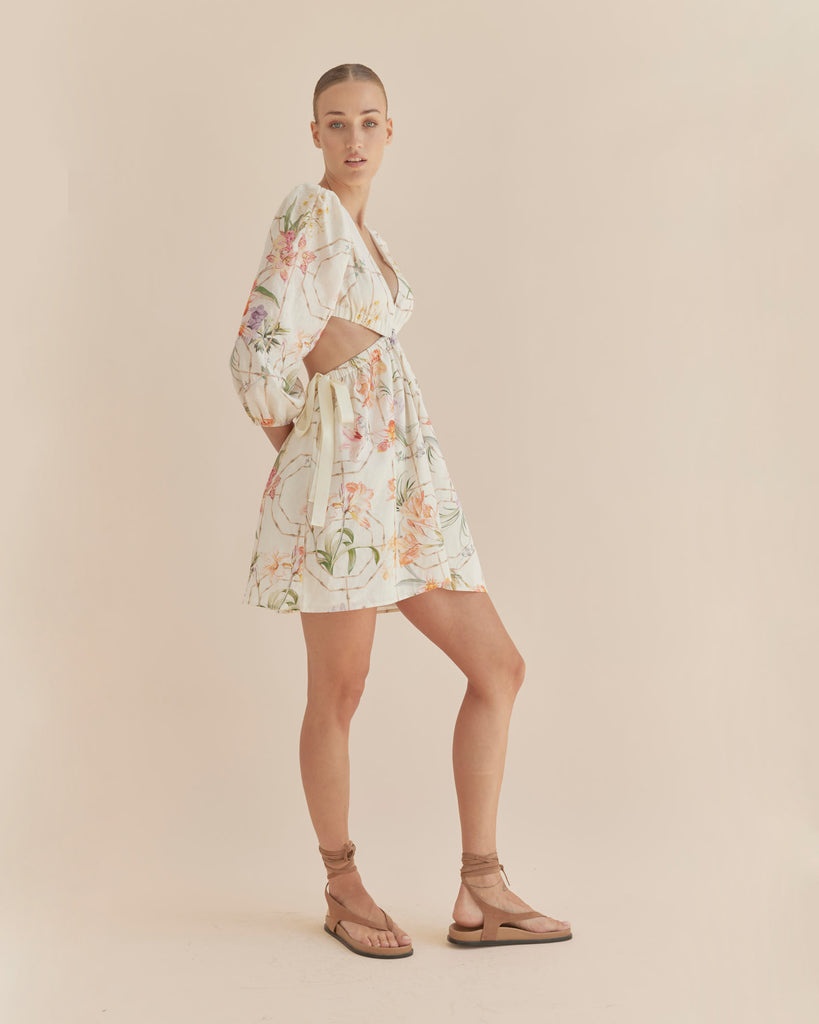 The Orangerie Long Sleeve Mini Dress combines romantic charm with modern flair. This dress features an exclusive print on a luxurious linen-viscose blend, with elegant cut-out details and voluminous sleeves that make it a standout piece for any occasion.