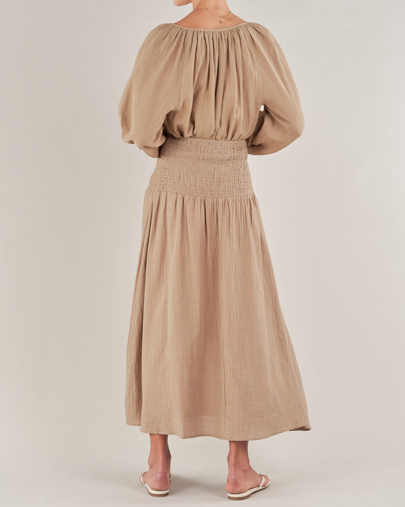 Lightweight and luxurious in an airy cotton linen fabrication, the Panama Linen Blouse is a warm weather essential. It features a a voluminous balloon sleeve with a soft elastic cuff to wear long or bunched around the elbow, with a flattering gathered, open v-neckline and a full, cascading silhouette. Easily take this look from beach to bar with the matching Panama Linen Gauze Maxi Skirt.