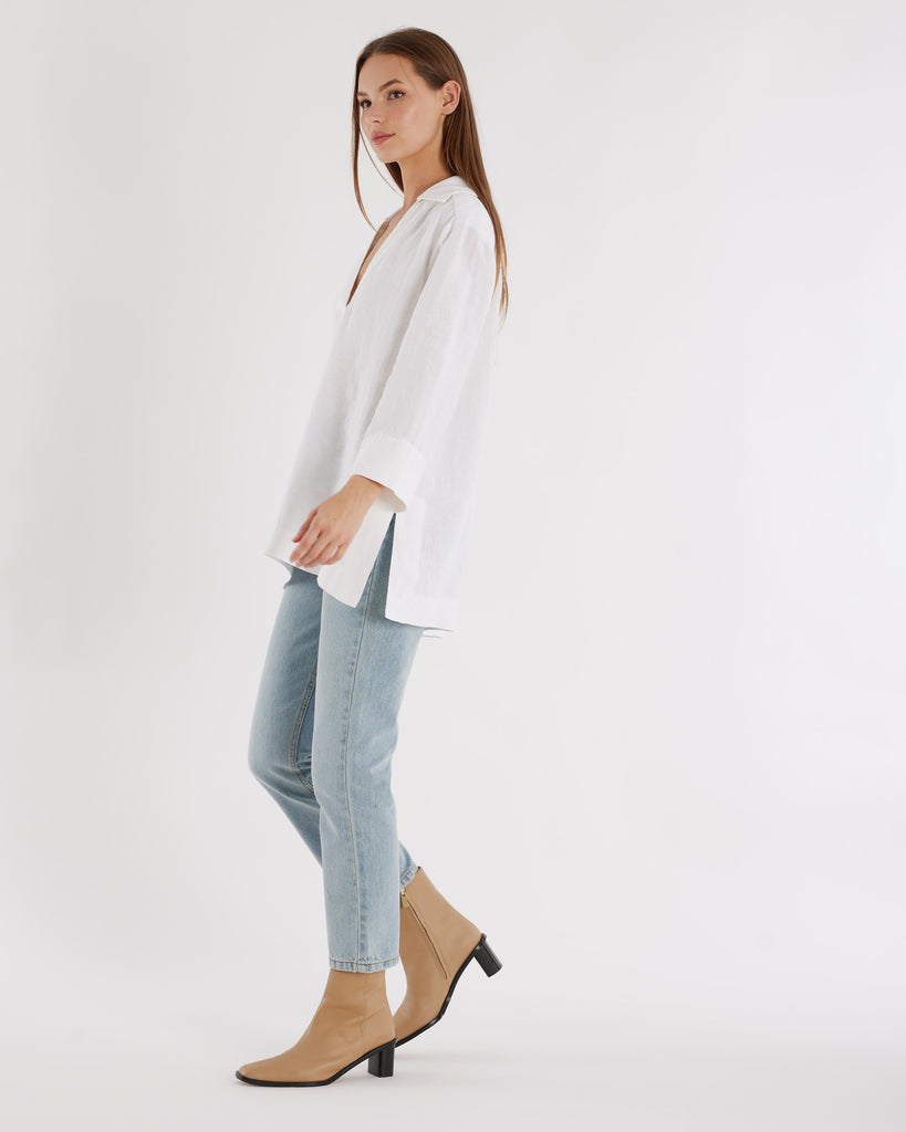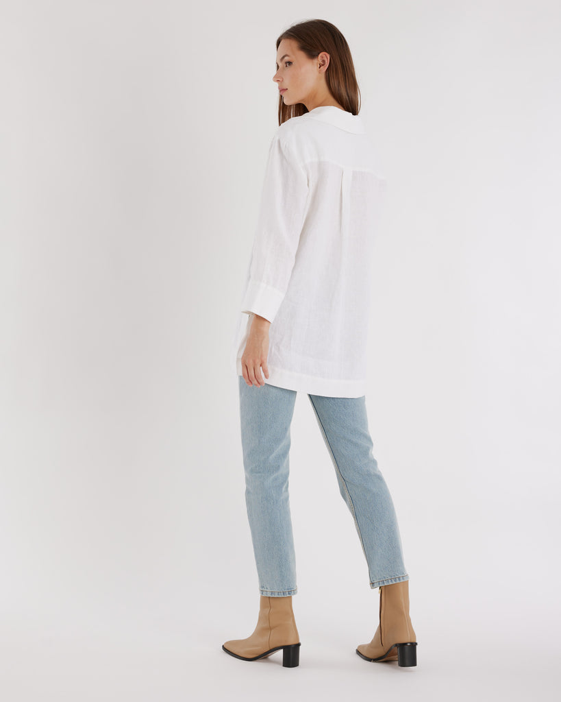 Cut in our signature heavy linen, the Pauline Linen Blouse functions easily as both a beach cover-up and sophisticated daily wear option this summer. Subtle side splits add a modern touch. A versatile addition to your wardrobe, this shirt effortlessly combines classic and contemporary aesthetics.