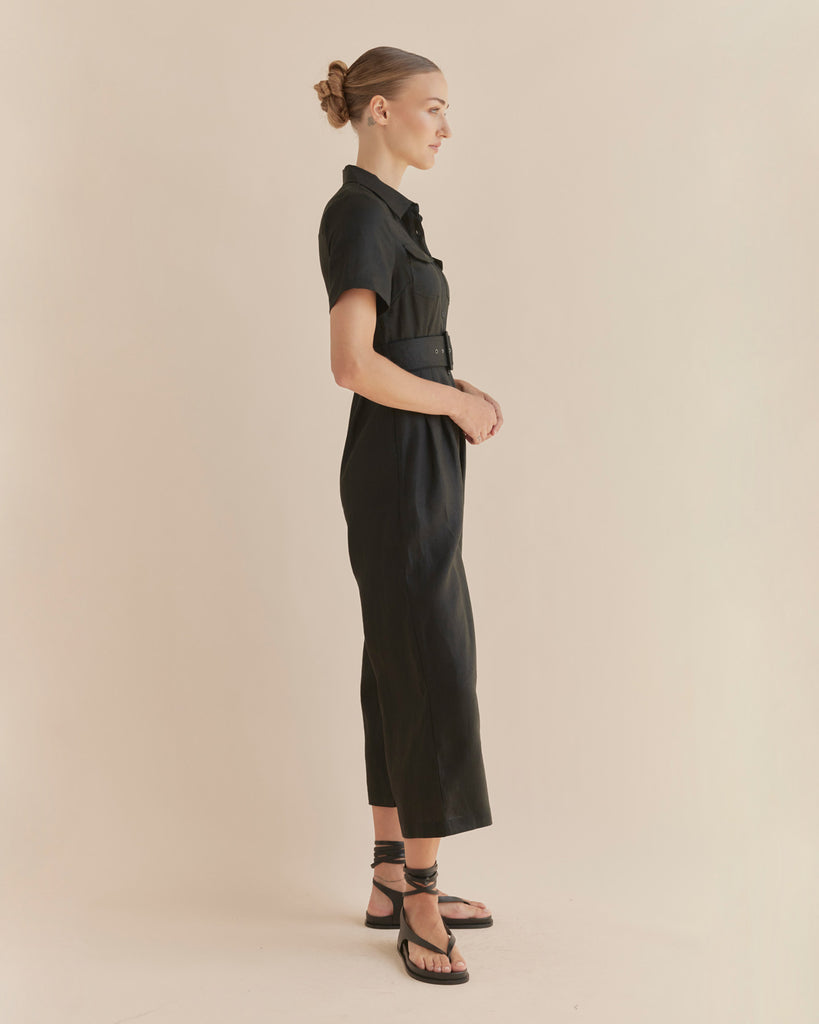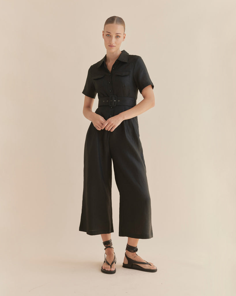 Designed for Springtime events and everyday ease, the Portsea Linen Jumpsuit is the ultimate trans-seasonal piece. Crafted with 100% linen, this luxurious jumpsuit will undoubtedly remain a wardrobe favourite. It’s detailed with a classic collar, buttoned front, breast pockets, slightly fitted bodice and wide legs. Use the self-covered belt to define your waist.