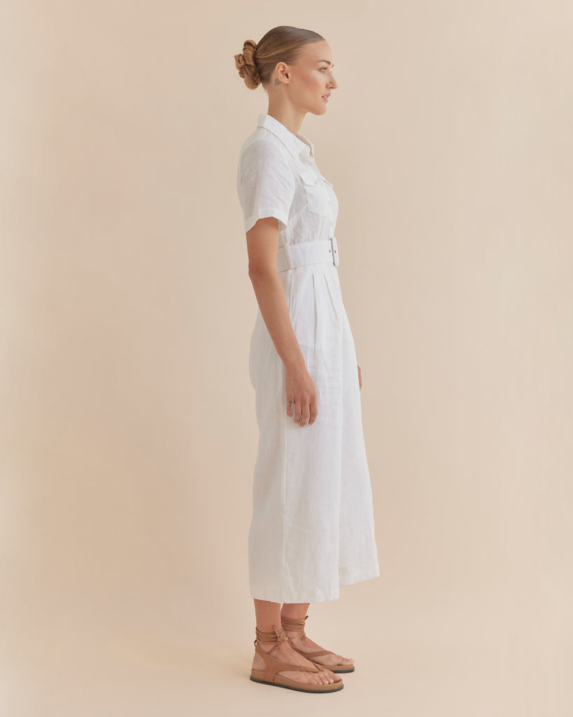Designed for Springtime events and everyday ease, the Portsea Linen Jumpsuit is the ultimate trans-seasonal piece. Crafted with 100% linen, this luxurious jumpsuit will undoubtedly remain a wardrobe favourite. It’s detailed with a classic collar, buttoned front, breast pockets, slightly fitted bodice and wide legs. Use the self-covered belt to define your waist.