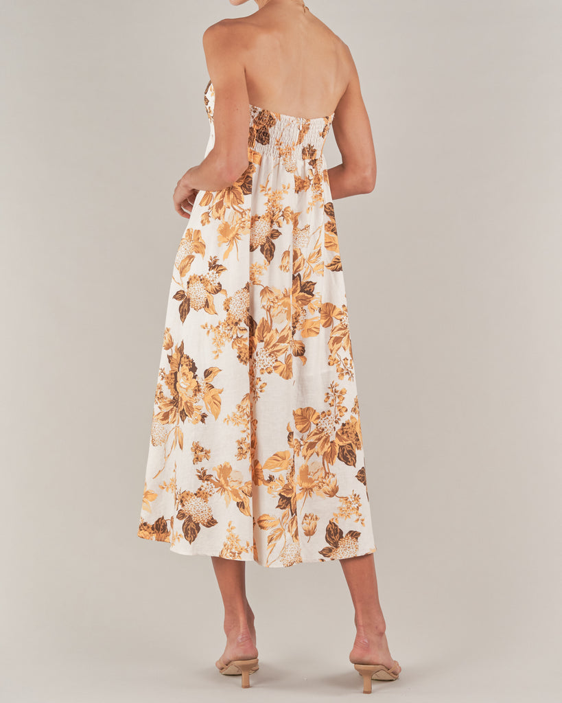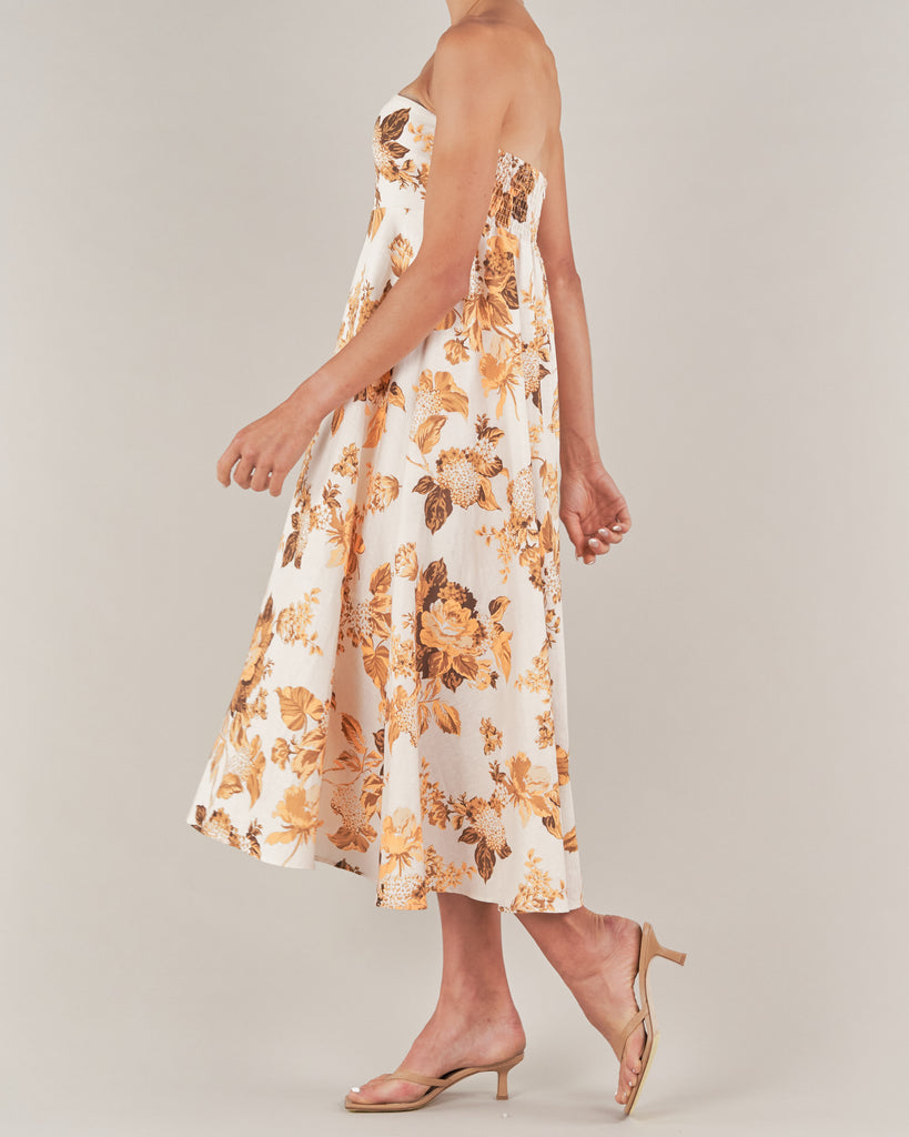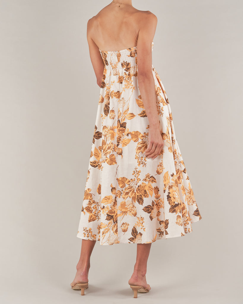 Breeze through your next event or warm-weather holiday in the Saint Lucia Linen Maxi Dress. Featuring a shirred bandeau shelf bodice that falls into a full length bias-cut skirt, this is an elegantly simple piece that lets the print do all the talking. Considered panelling throughout the skirt and a wide hem sees the dress drape effortlessly across the body in one soft motion.