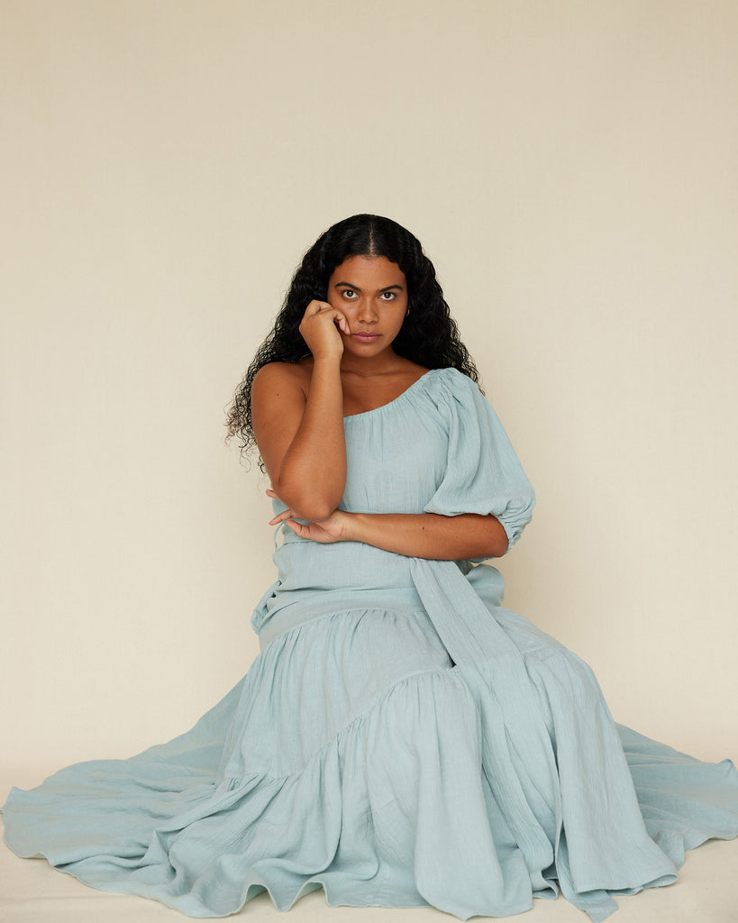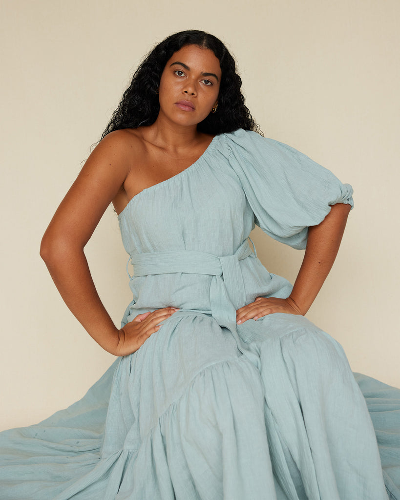 Forever wishing for an eternal summer with the Saloma Linen One Shoulder Dress. Cut from a quality 100% linen fabrication, this beautiful dress delivers all expectations. Defined by its one shoulder, it features a blouson sleeve outlined by a single ruffle, a removable self-covered belt to enhance the waist and a tiered skirt that falls into an a-line cut for easy movement. Perfect for day or night.
