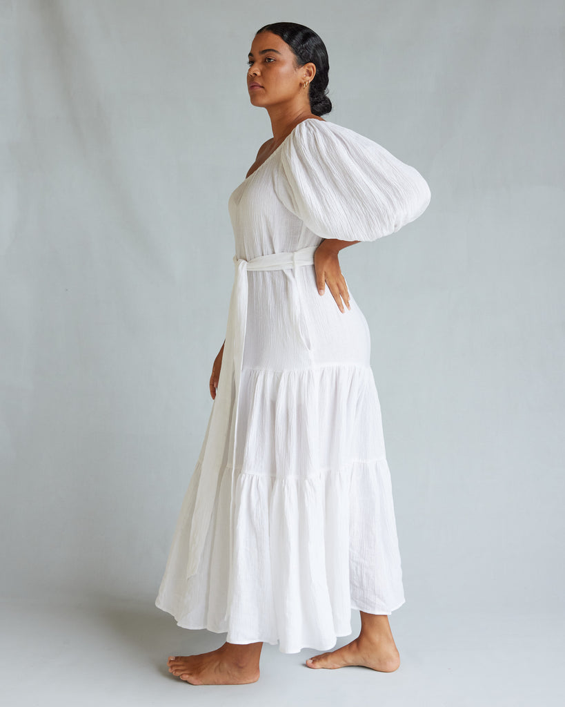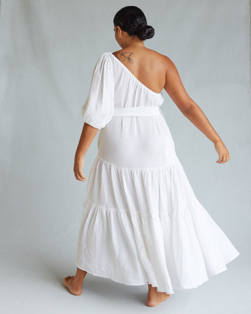 Forever wishing for an eternal summer with the Saloma Linen One Shoulder Dress. Cut from a quality 100% linen fabrication, this beautiful dress delivers all expectations. Defined by its one shoulder, it features a blouson sleeve outlined by a single ruffle, a removable self-covered belt to enhance the waist and a tiered skirt that falls into an a-line cut for easy movement. Perfect for day or night.