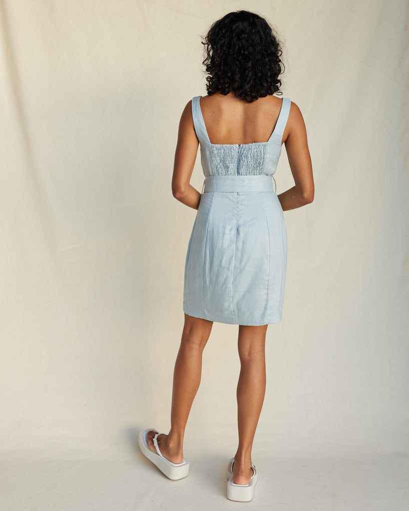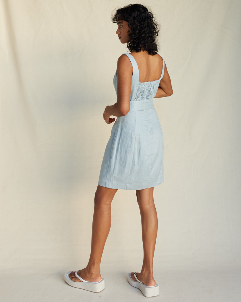 Show a bit of leg in the Silas Linen Mini Dress. Cut from 100% linen with a shirred back, waist belt, invisible zipper, and kick pleat, this classic mini is a wardrobe essential. Dress it up with heels for a fancier occasion or sandals for a casual, everyday look.