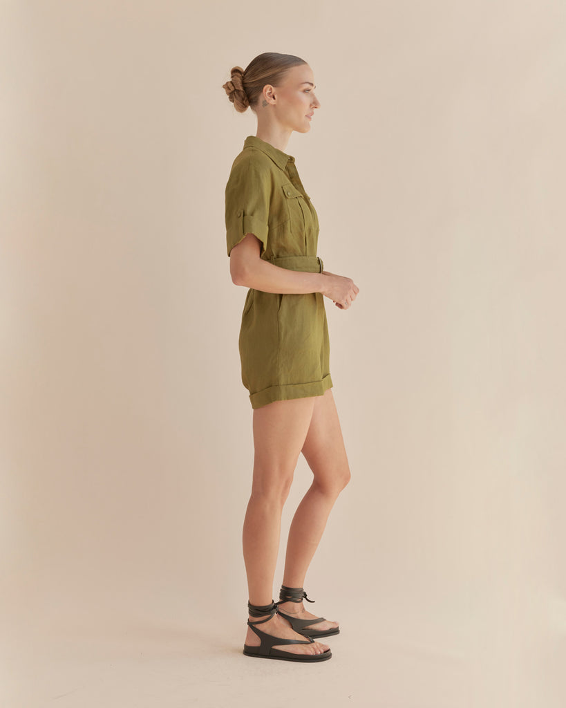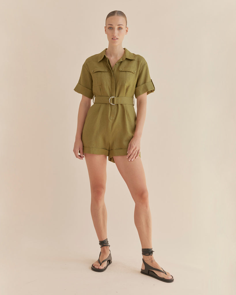 The Surreal Linen Playsuit is a breathe easy wardrobe classic defined by its essential details. Featuring a heavyweight 100% linen fabrication, rolled cuffs, dual side pockets, and a self-covered D-ring belt, it's a utility-inspired piece that does all the work for you. Size up for a relaxed fit as seen on our model, otherwise true to size.