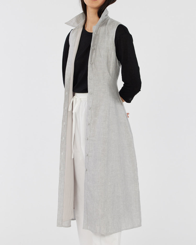 The Vento Linen Dress is a masterpiece of sophistication and versatility. This sleeveless dress showcases a collared neckline, button-down front and dual side pockets providing practicality without compromising style. With its full lining and adjustable back ties, this dress ensures a smooth and comfortable fit. This versatile product can be worn as an elegant dress for a sophisticated look or layered over pants as a stylish long vest, offering endless possibilities to elevate your outfit for any occasion.