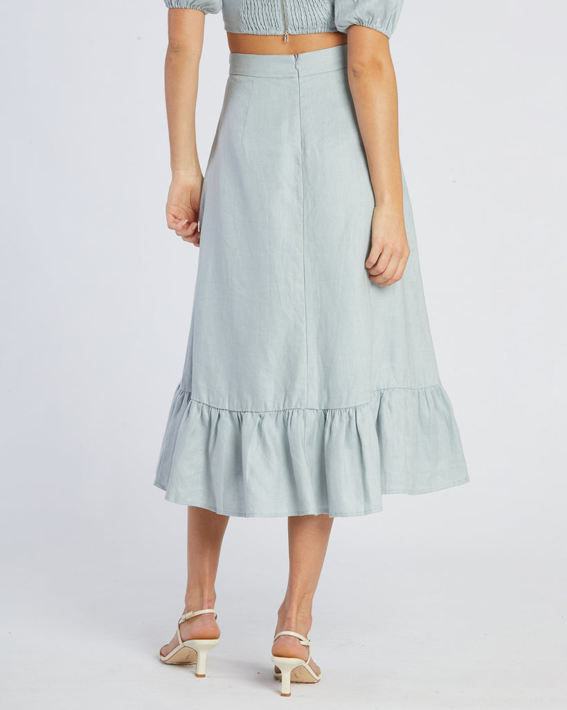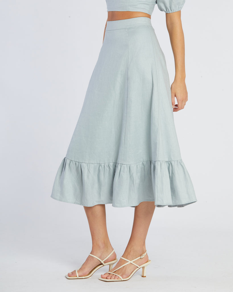 Classic and feminine, the Violetta Skirt is the ultimate wardrobe staple. Made from 100% linen fabrication, it features a ruffled hemline, invisible zip closure, fitted waist and an A-line shape. Style this linen skirt with a simple top or our matching Violetta Crop Top.